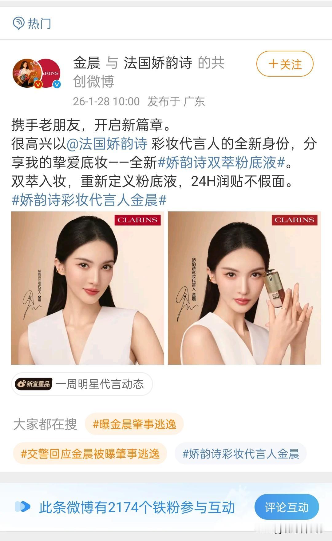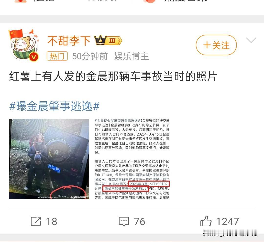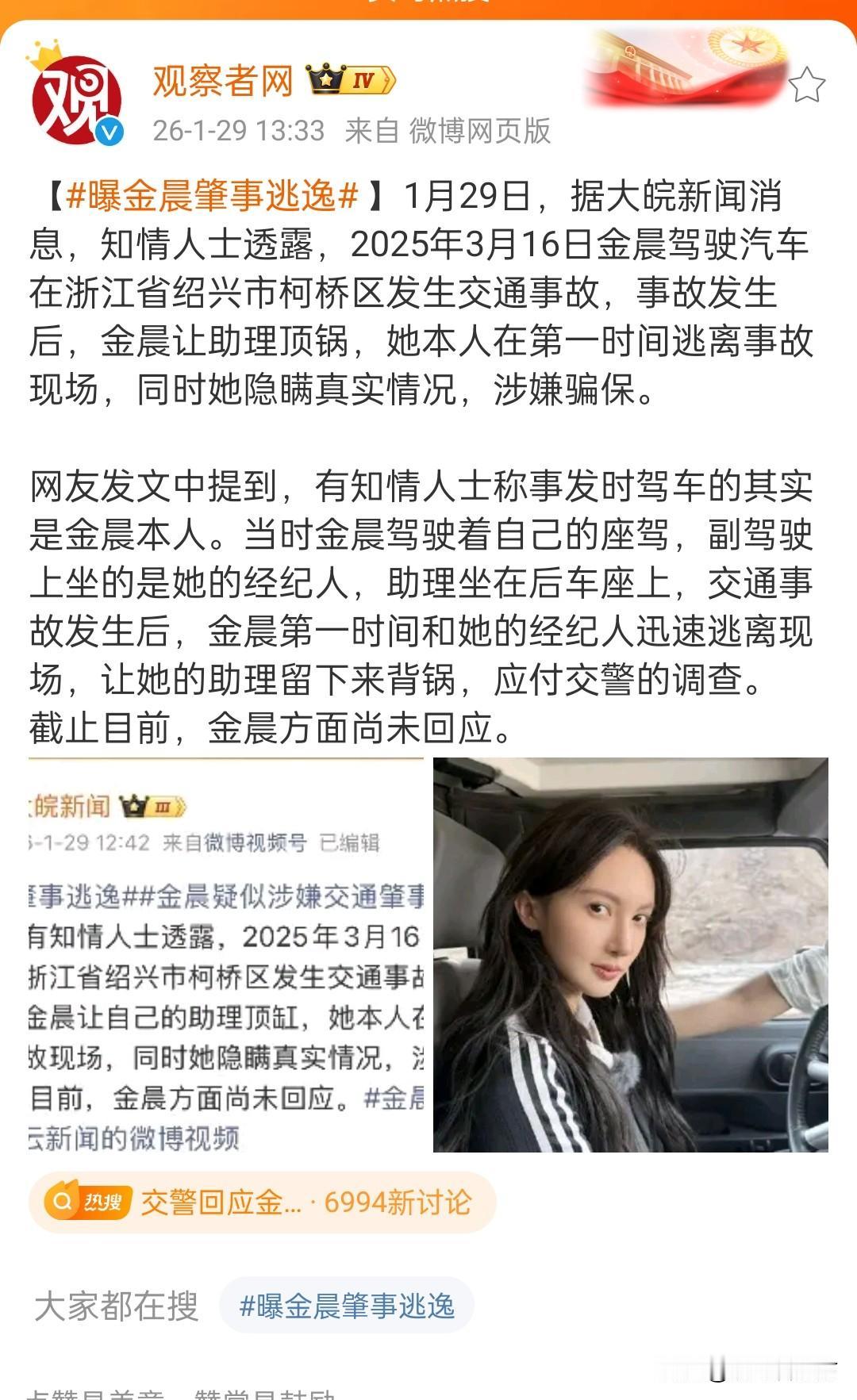 28日金晨代言法国某老牌子化妆品牌,29日就被曝光肇事逃逸拉助理顶包,这里是不是和这个代言商务有关?抢了谁的代言造成的?还是竞争品牌扔石头?或者说和代言没关系,就是有仇家挑了这个关键节点拉她下马?这都是有可能的。要不然怎么去年3月的新闻,隔了快一年才被有心人扔出来,不合理。不知道是哪个账号或者哪个媒体第一个报道的,这才是知情人。当然,金晨如果真如同曝光里说的那样,这么干当然是错的。可为什么要逃逸且找人顶包呢?是当时有没法接触交警的苦衷?