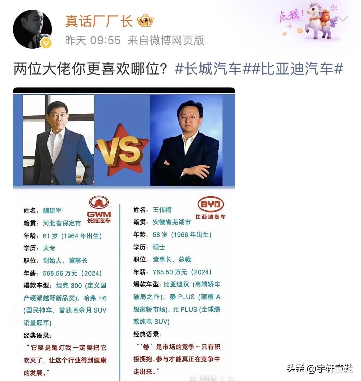 博主:“下图这两位大佬大家更喜欢哪位?” 话说,如果拿任正非老爷子跟船夫哥对比的话,还真不敢说大家会更喜欢谁,但就图中的大佬来说,小编觉得,100个人中应该有90个人会更喜欢船夫哥吧?所以也就是占比90%! 简直就是降维打击!大家觉得呢?[呲牙]