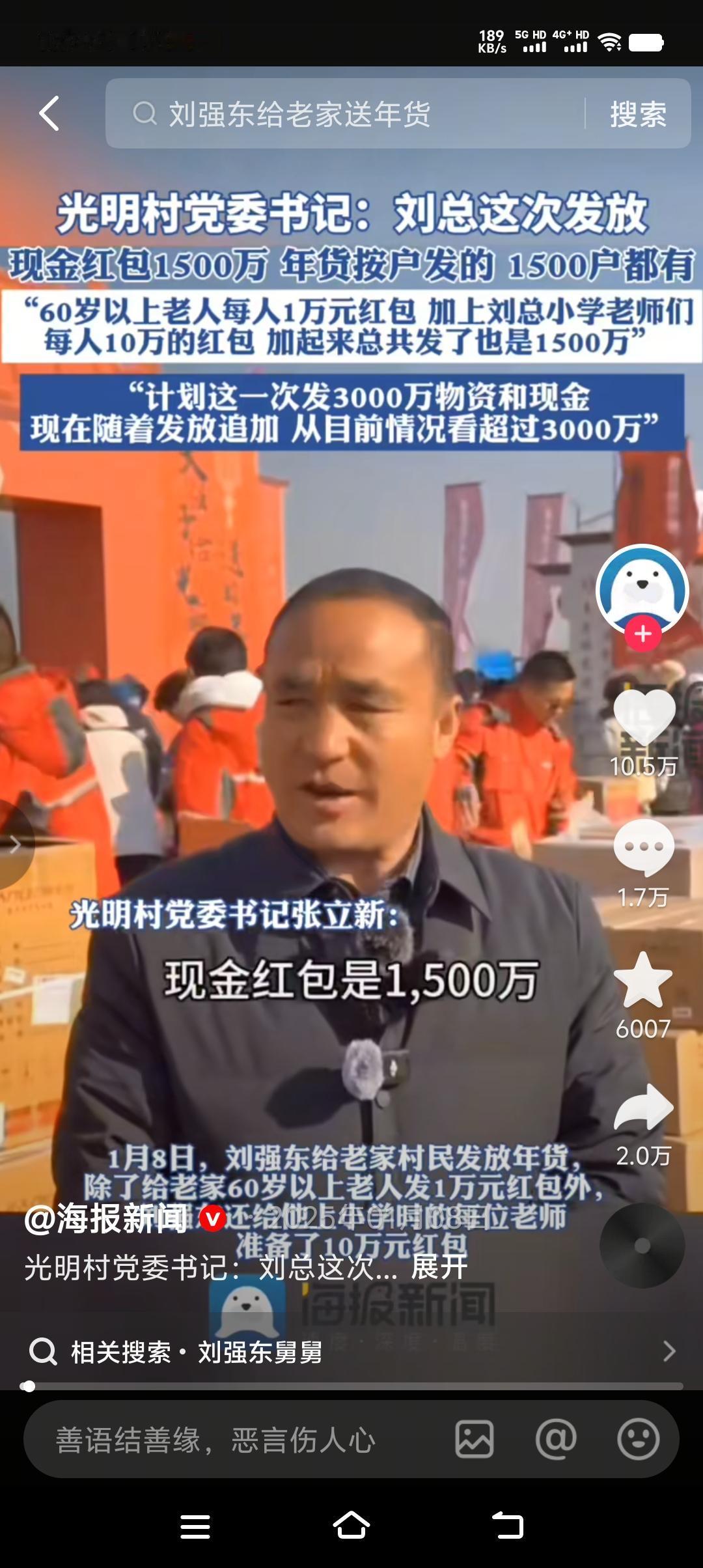 江苏省宿迁市的光明村出名了,每个村民脸上都洋溢着幸福、自豪的微笑。它不是因为有个带头致富的村长出名了,也不是因为村民的幸福指数高出名了,而是因为村里走出了一位吃水不忘挖井人的大人物,他就是人人皆知的京东总裁刘强东。 滴水之恩涌泉相报,吃水不忘挖井人,这两句话放在刘强东身上再合适不过了。当年村民们攒了76个茶蛋和500块钱送18岁的刘强东上人民大学,刘强东永远把村民这份恩情记在心里。光明村不仅是生他养他的地方,更是成为他永远割舍不下的地方,因为那里不止有他的父母亲,更主要的是有1500户让他魂牵梦绕的村民。
