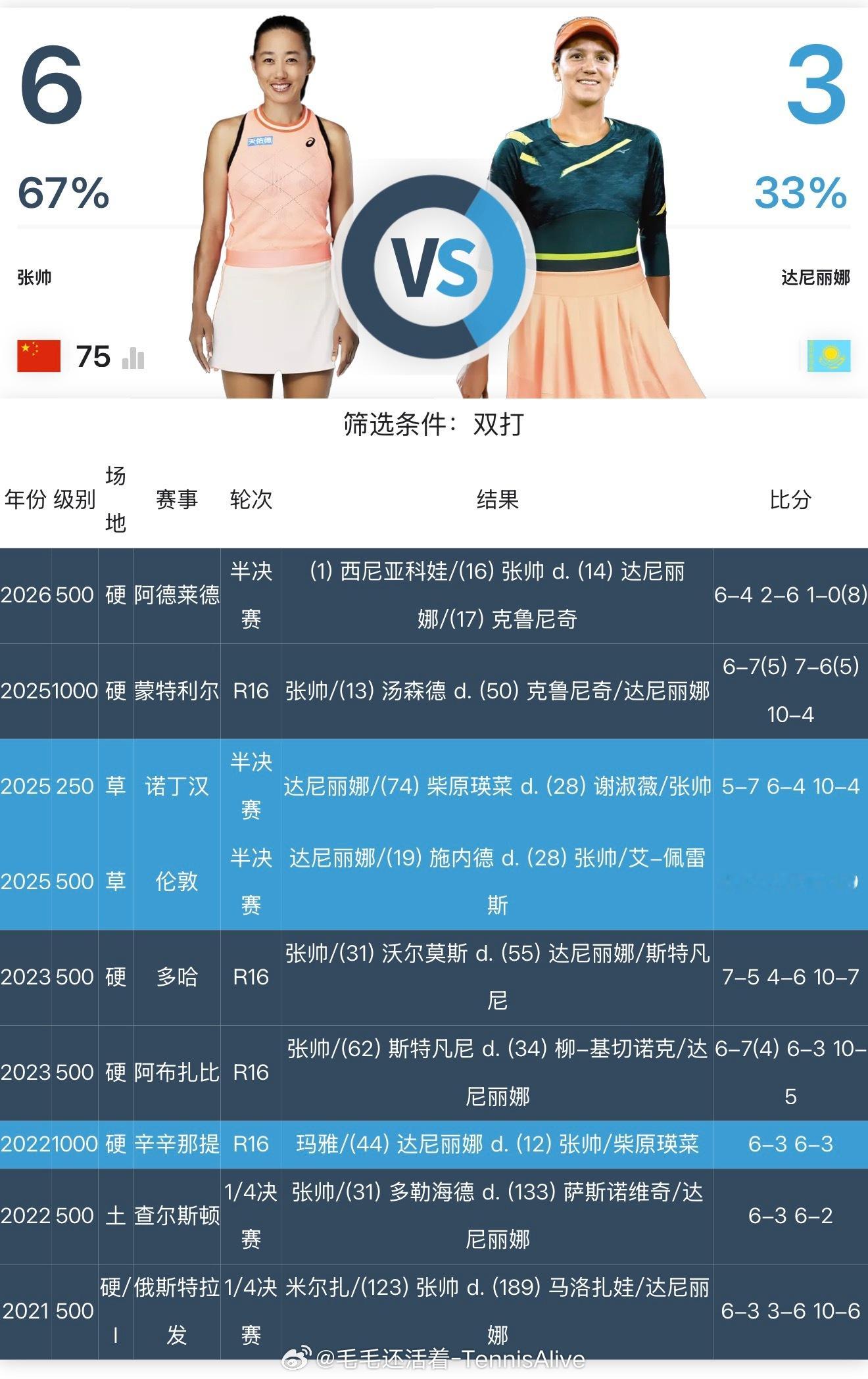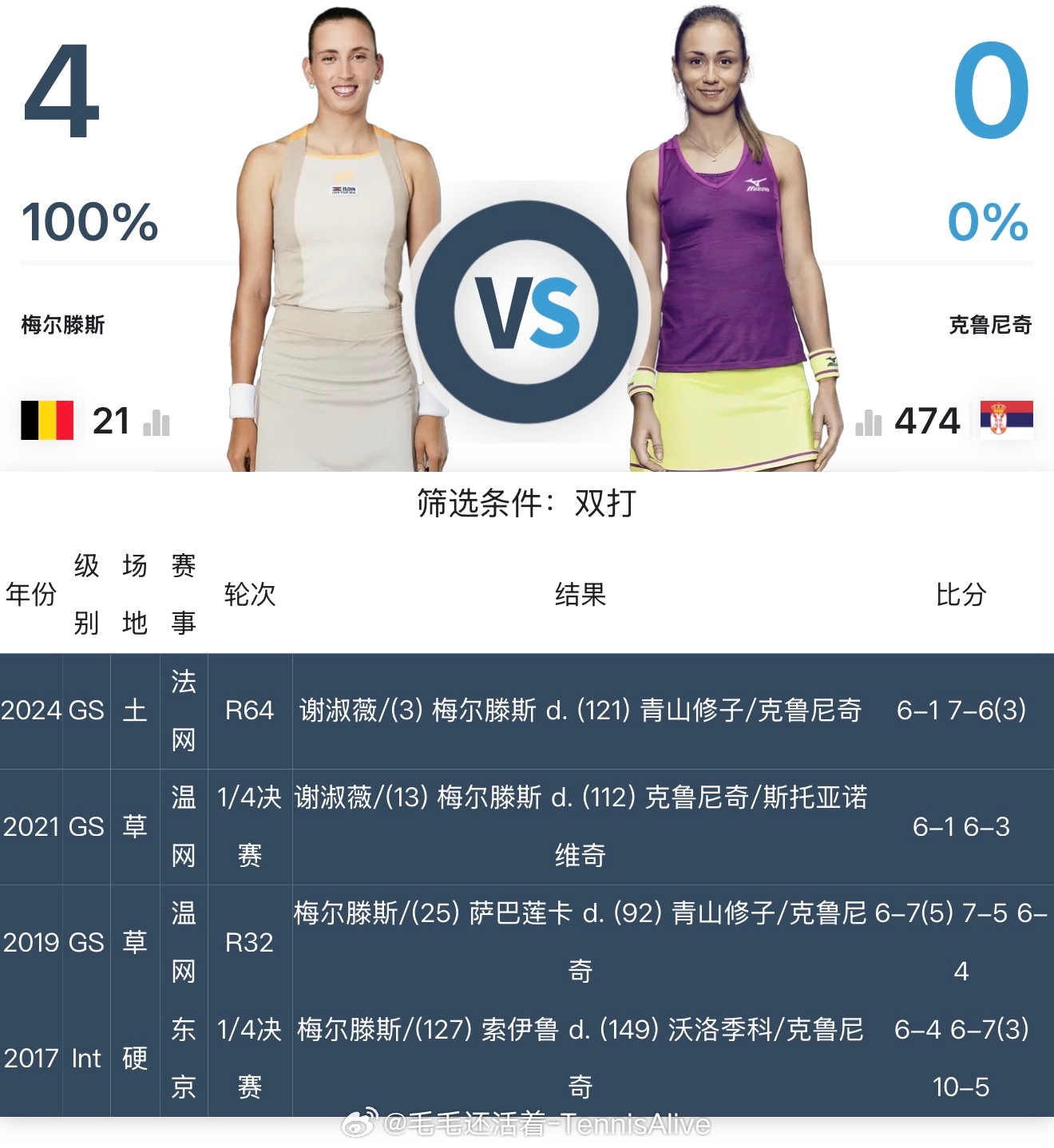 张帅/梅尔滕斯决赛的对手是达尼丽娜/克鲁尼奇。张帅对两人的双打战绩是 9 胜 4 负,梅尔滕斯更是 7 胜 0 负。这双决赛机会很大,决赛见! 张帅五进大满贯决赛张帅进澳网女双决赛这很澳网