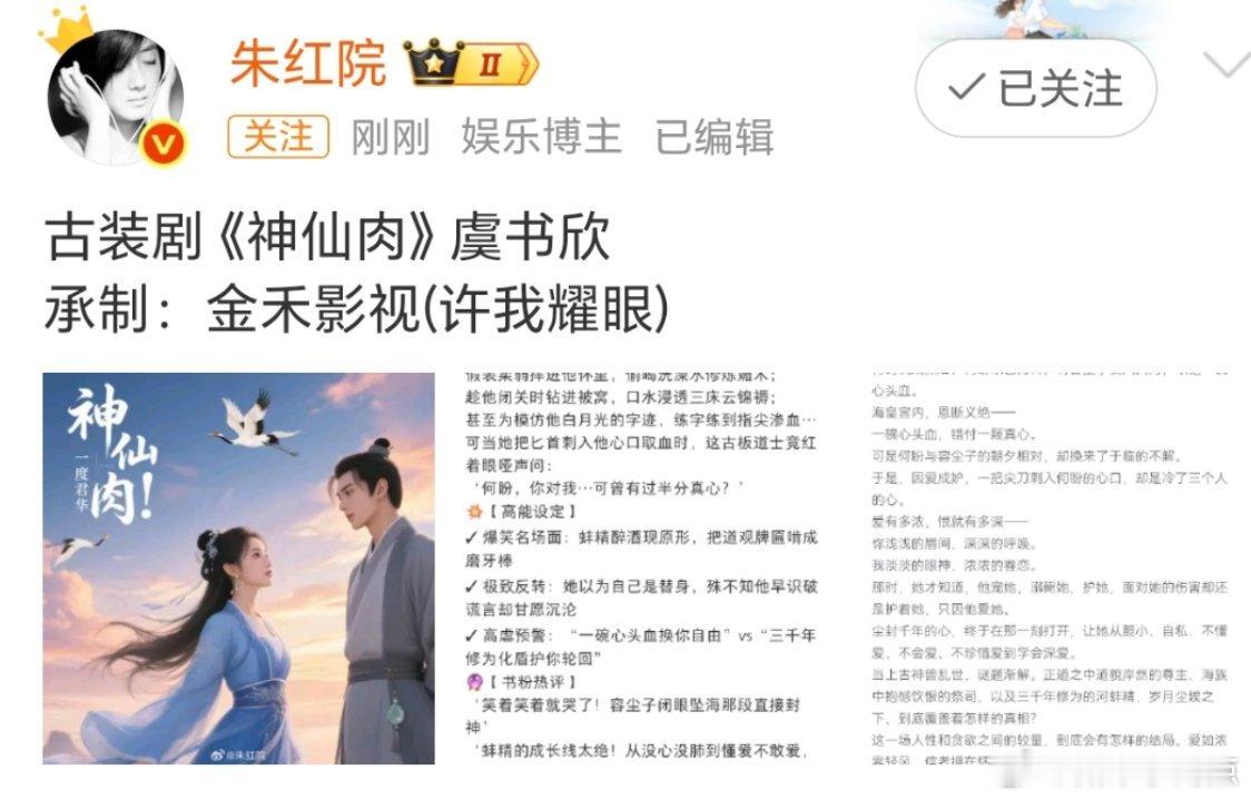 虞书欣的新饼古装剧《神仙肉》承制:许我耀眼这是看上赵露思爆剧的班底了嘛?你别说,这部剧的设定我还挺喜欢