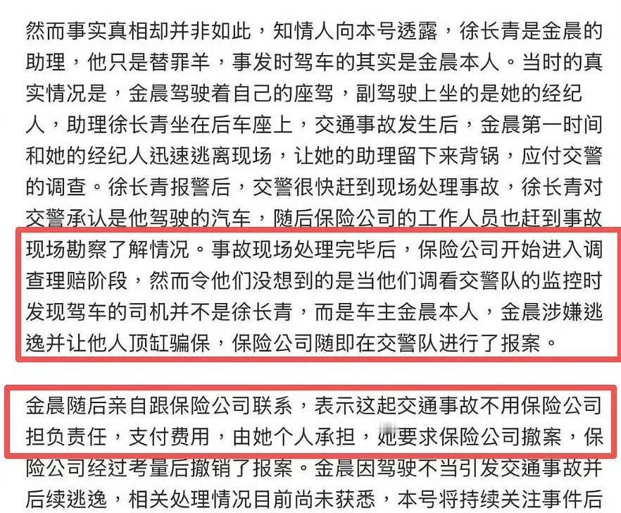 金晨这是什么脑回路和动机啊? 本来只是撞了警示牌和围墙,属于小事故,完全可以照价赔偿、自费维修就行,可她居然选择逃逸,还让助理顶包,后续甚至敢走保险。这就很耐人寻味了。 相当于在错误的基础上不断加码,把普通的交通事故升级成了刑事风险。大家纷纷猜测,最大的可能就是她当时酒驾了。 从中午发酵到现在,这个热搜阅读量都破10亿了。她今晚本来有“娇诗韵”的品牌直播,现在品牌已经把她的直播安排给删掉了。 到现在她本人也没有任何回应,相关的工作已经开始被品牌方切割。这事,大概率是真的了。