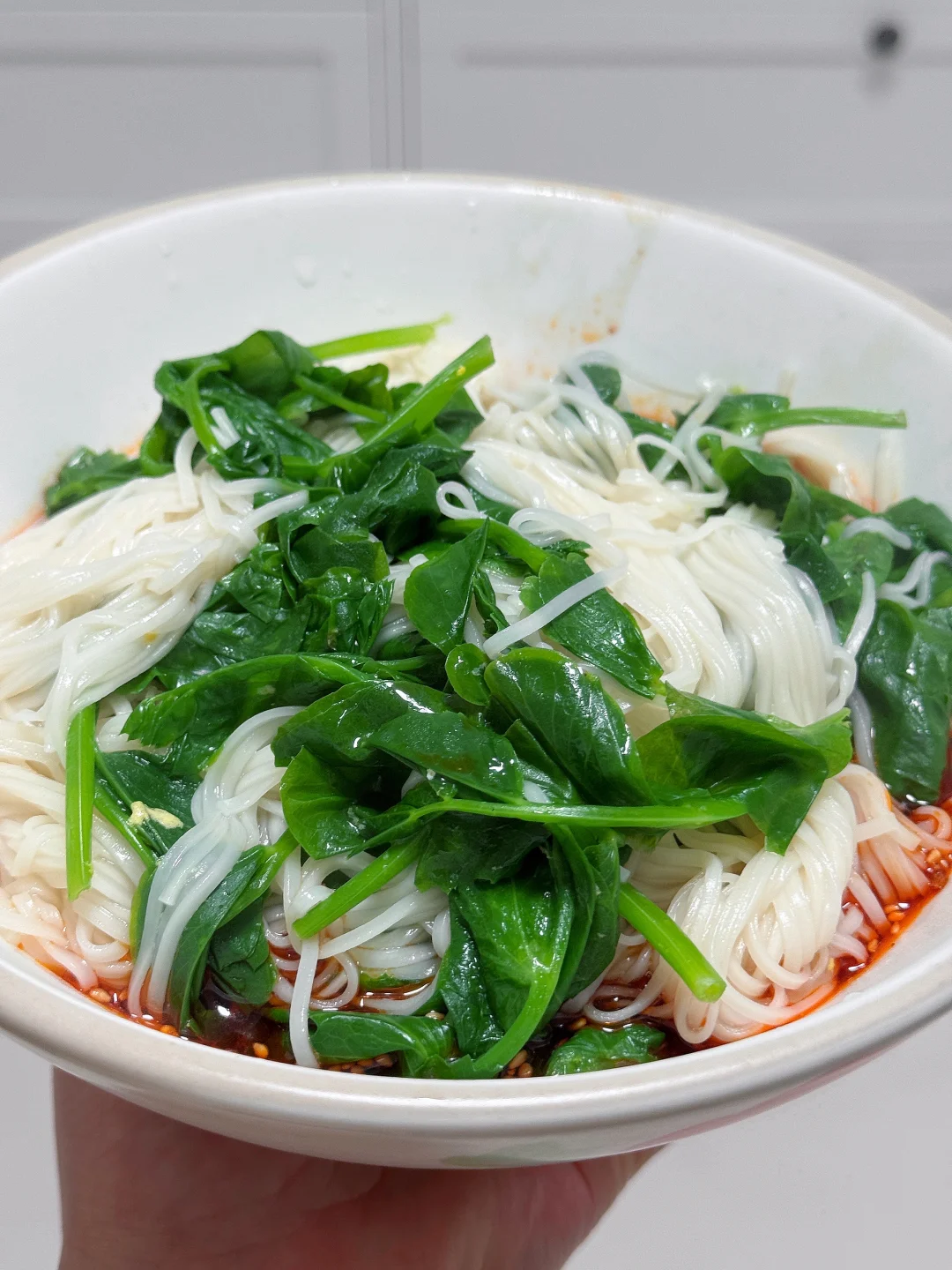 今天做麻辣干拌面。 🍜料汁:适量鸡精、食盐、生抽、老抽、陈醋、花椒油、芝麻、香油、辣椒油、剁椒 📜先煎一个鸡蛋➡️水开后把面条煮熟➡️放入豌豆尖烫熟➡️全部捞至碗中,烫熟即可。