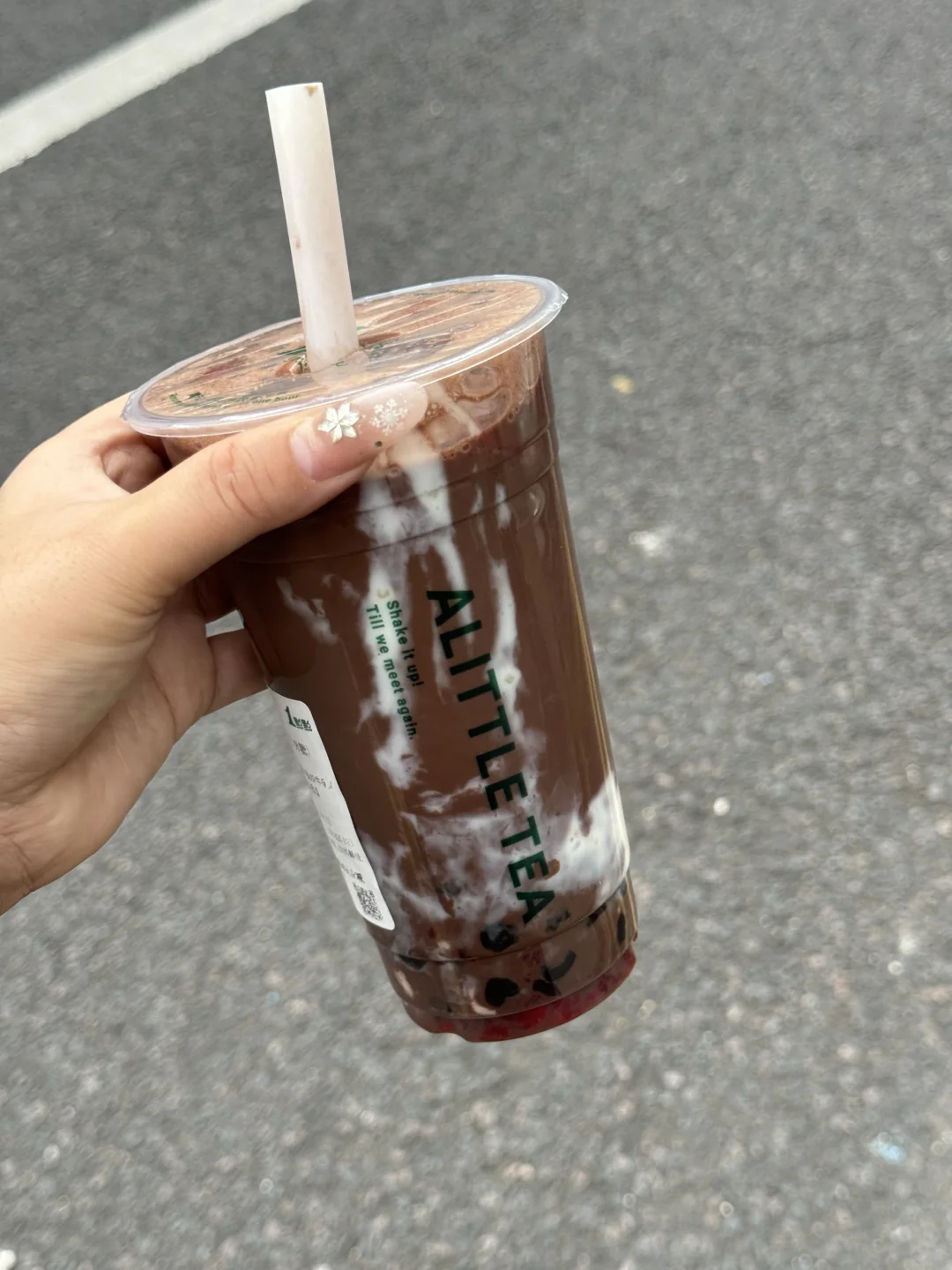 此女喝商极高!! 已经好喝到不知天地为何物了!!! 可可草莓换A2牛乳➕米麻薯➕小珍珠➕波霸!! -