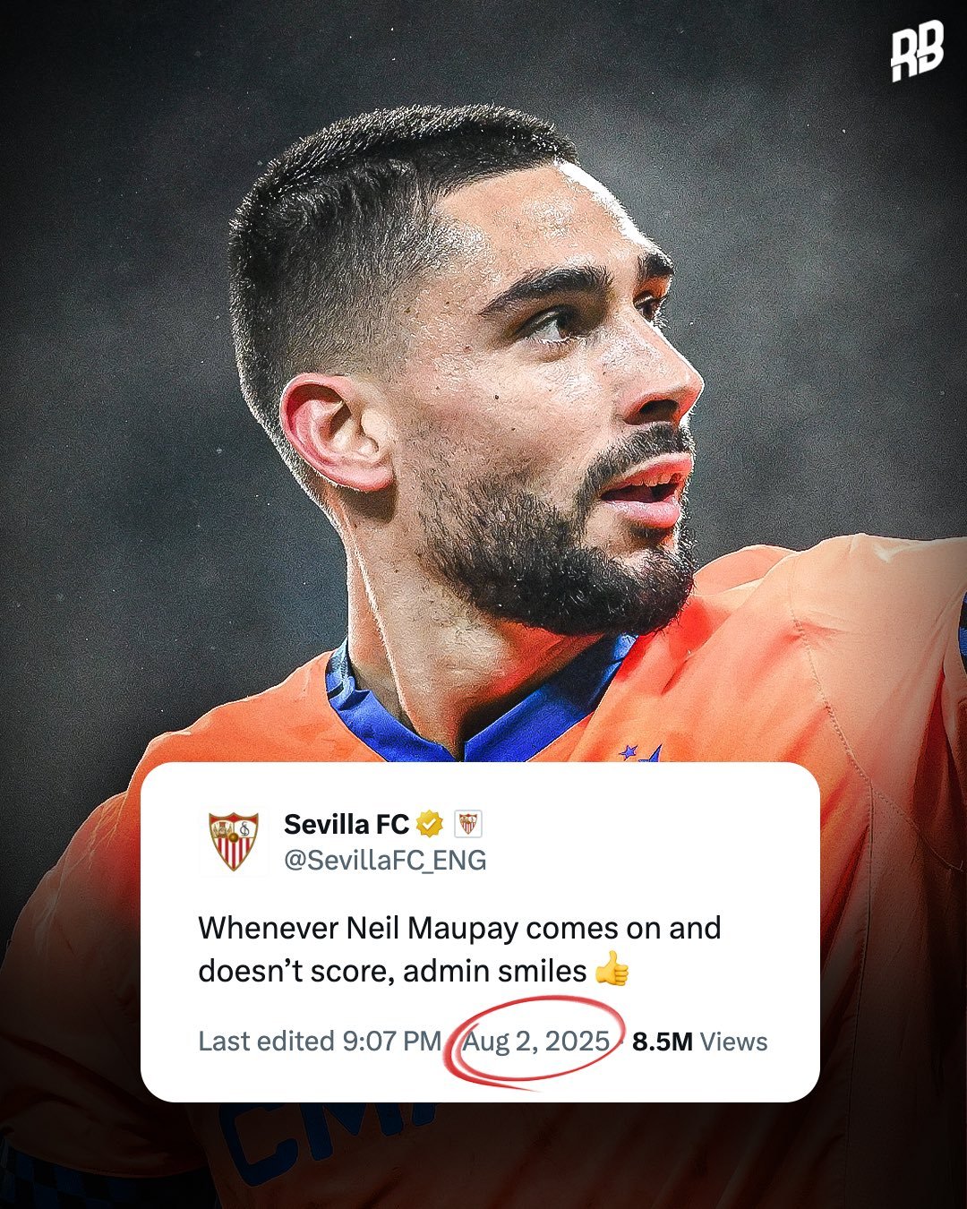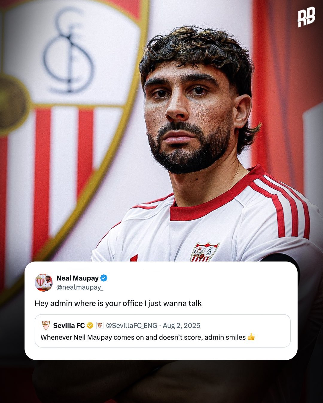 可让我逮住你小子了 2025年8月,塞维利亚在热身赛中1-1战平马赛,马赛前锋尼尔-莫派替补登场但没有进球。赛后,塞维利亚官推发布了一条帖子:“每当莫派被换上场却没能进球,管理员都想笑。”不料半年后的2026年1月,莫派从马赛租借加盟塞维利亚,并翻出了这则嘲讽他的帖子,回复道:“管理员,你的办公室在哪,我要找你聊聊。”很快,莫派就晒出了与塞维利亚社媒管理员的合照:“女士们先生们,我抓住他了。”