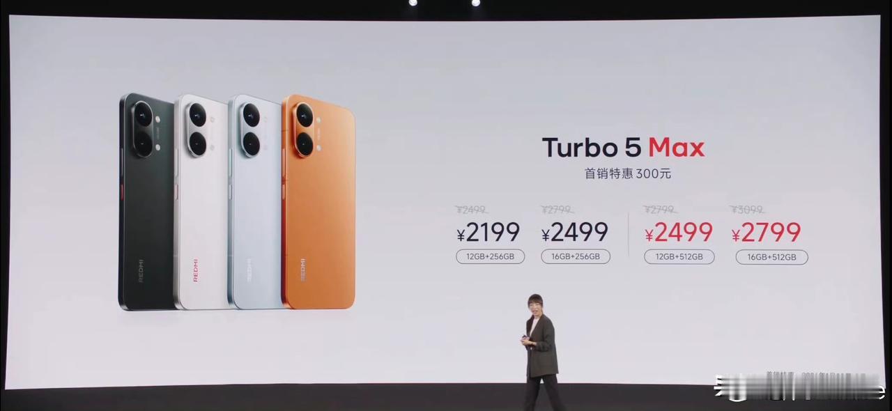 红米turbo5max首销价2199起!大内存12+512GB只要2499起!这个价格看起来还不错,还能再叠加一手国补,红米也是首销价,原价2499起!不过这个首销期挺长的,一直到3.3号[捂脸]这个12+512GB性价比拉满了!红米turbo5标准版起售价是1999,果然就是主推max版本,turbo5max主要就是天玑9500s+9000毫安+IP69K防尘防水,这方面比红米K90略有优势