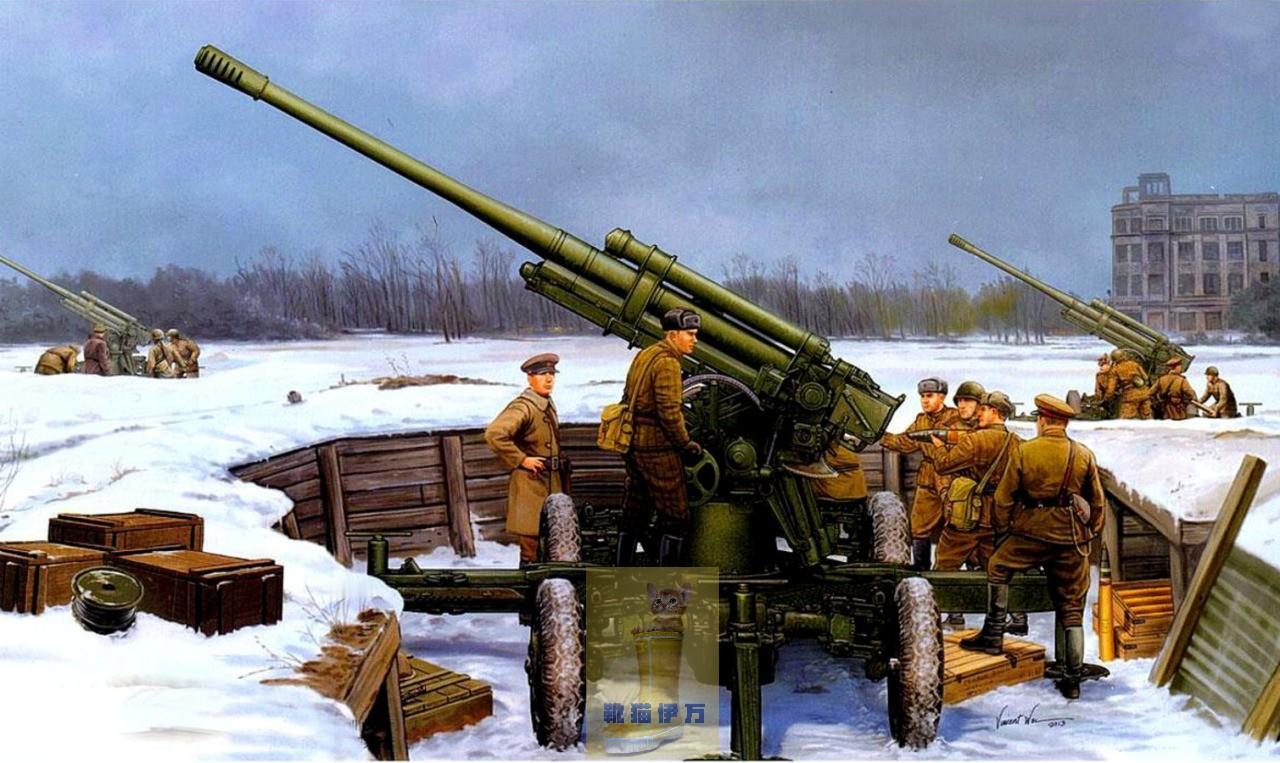 1942 年,东线。苏军加里宁方面军的高射炮阵地上,一门 52-К型 85 毫米高射炮的炮组做好了开火准备。 1942 年是苏德战争最艰难的相持期,加里宁方面军作为东线北部核心作战力量,驻守莫斯科西北方向的加里宁地区(今特维尔),是莫斯科保卫战的重要侧翼防线,核心任务为抵御德军北方集团军群的进攻、掩护莫斯科侧翼安全。此时德军仍保持对苏军的空中优势,频繁出动轰炸机、俯冲轰炸机空袭苏军阵地、交通线和后方枢纽,85 毫米高射炮作为苏军中口径主力高炮,是加里宁方面军要地防空 + 野战伴随防空的核心装备。 52-К型 85 毫米高射炮(Зенитная пушка 52-К 85 мм,参见图2~4)是苏军二战经典中口径高射炮,1939 年定型列装,是 1942-1943 年苏军防空体系的核心装备,也是后续 T-34/85坦克主炮的原型,兼具防空 + 反坦克双重能力。 该炮有效射高约 10500 米,最大射速 15-20 发 / 分,可拦截德军 Ju 87 俯冲轰炸机、He 111 轰炸机等主流机型,配备机械瞄准具 + 光学测距仪,后期可衔接雷达制导,适配前线要地防空。而1942 年德军虎式坦克出现后,苏军发现该炮可在千米内击穿虎式正面装甲,成为苏军早期反重型坦克的核心应急火力,是东线首个能有效对抗德军重型坦克的中口径火炮。