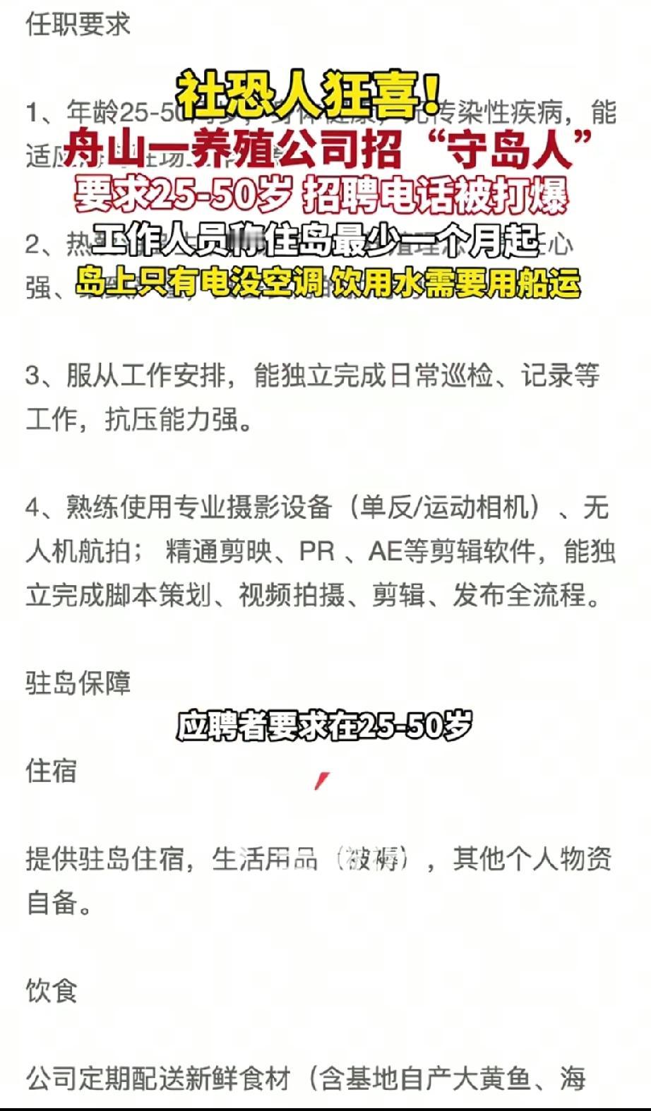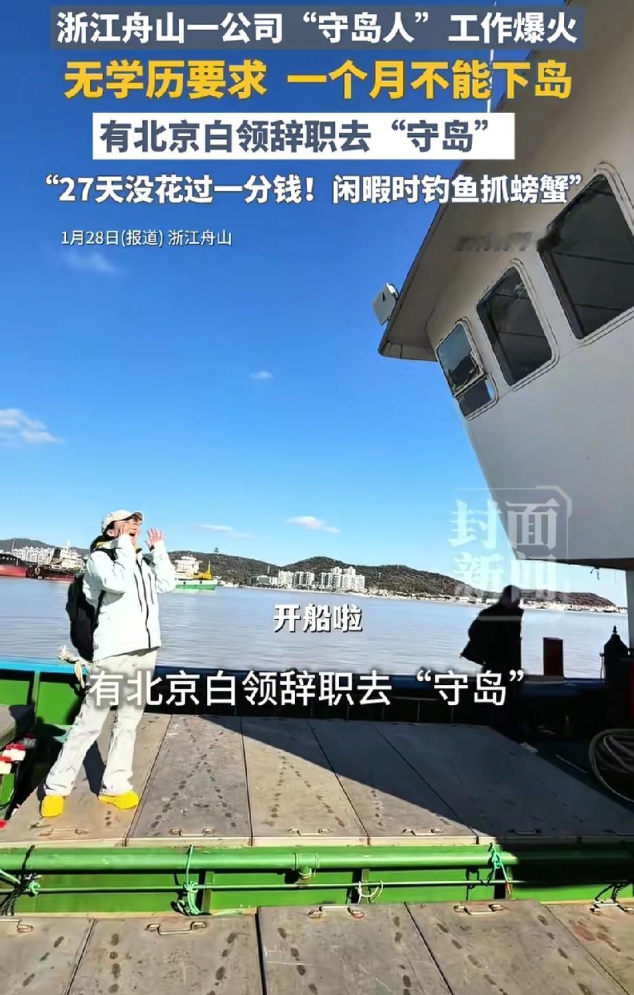你敢来吗?浙江舟山东寨岛招聘“守岛人”,本以为艰苦少人问津,结果咨询电话被打爆,负责人却直言这份工作能让人27天不花一分钱,三餐吃海鲜、面朝大海,但岛上生活条件艰苦,至少得住一个月才能下岛,对人的毅力和吃苦能力都是大挑战。 这份工作到底是怎样的呢?我们得拆开来看: 首先“乐”的一面——自然的馈赠: 经济上的解脱:“零消费”是最大的亮点。在岛上,没有房租、交通、外卖和娱乐开销,物欲被压缩到近乎为零。 物质上的富足:“三餐海鲜”满足了人们对“靠海吃海”的浪漫想象。这种直接来自大自然的免费馈赠,是城市里花高价也买不到的新鲜。 精神上的放空:“面朝大海”意味着绝美的景色和远离人际纷扰的清净,这对于疲惫的都市灵魂来说,是顶级的奢侈品。 其次“苦”的一面——真实的生存: 极致的孤独:这是最大的心理考验。你的同伴可能只有风声、海浪和海鸟。没有亲人朋友,没有即时通讯的热闹,这种孤独会吞噬掉大部分浪漫幻想。 物资的匮乏:除了海鲜,其他生活物资可能都紧缺。淡水需要节约,蔬菜水果是奢侈品,生活用品需等待补给船。这不仅是艰苦,更是一种生活方式的重构。 体力的考验与天气的暴击:工作需要体力,而海岛的气候说变就变,狂风、暴雨、烈日、湿冷,都需要用身体去硬扛。住处往往简陋,没有都市的便利设施。 这根本不是一份工作,而是一种完整的、剥离了现代文明缓冲垫的生存方式。公司不要求你的学历,却苛刻地考验你的生命力、忍耐力和精神强度。 有网友说,是“豁出去,我想去”:“这哪是工作,这是救我命啊!”“每天被老板和甲方折磨,我宁愿去跟海风打交道。” 他们是被职场内卷、复杂人际关系和天价生活成本逼到墙角的年轻人,这份工作成了他们脑海中的“逃生出口”。 有太多人正在感到窒息,渴望一次彻底的“断联”和“清空”。“27天不花钱”触动我们,是因为我们厌倦了当“人肉干电池”和“消费永动机”;“面朝大海”吸引我们,是因为我们的办公隔间和出租屋里,真的看不到远方。 另一派是“算了吧,我不行”:“让我旅游三天可以,常住我会疯。”“没Wi-Fi这一条,就足以击退我99%的冲动。”他们清醒地认识到自己对现代科技和社会连接的深度依赖。 我们集体羡慕的,或许是一种生活的“可控感”。在岛上,生活虽然艰苦,但目标简单直接:照顾好自己,完成工作。而在城市,我们常常被无数看不见的线拉扯,感到忙碌却又虚无。 它让我们追问:幸福的生活,到底需要多少物质来铺垫?内心的平静,是否一定要逃到天涯海角才能寻得? 也许我们每个人,都需要在内心筑起一座“岛屿”。 这座岛,是一个可以让你暂时屏蔽噪音、回归简单、自我滋养的空间。 它可以是下班后关掉手机的一小时阅读,可以是周末去城郊山野的一次徒步,也可以是培养一个让你全心投入、忘记功利的爱好。 真正的“面朝大海,春暖花开”,不在于地理位置,而在于生活心态。与其羡慕别人27天的“零消费”实验,不如审视一下我们日常中那些“非必要”的消费和焦虑。 生活的选择权,始终在我们自己手里。 是继续在格子间里“卷”,还是去寻找自己的“岛”,抑或是在当下的生活中,开辟出一片心灵的“自留地”?这个问题,值得我们所有人深思。 舟山招“守岛人”工作电话被打爆