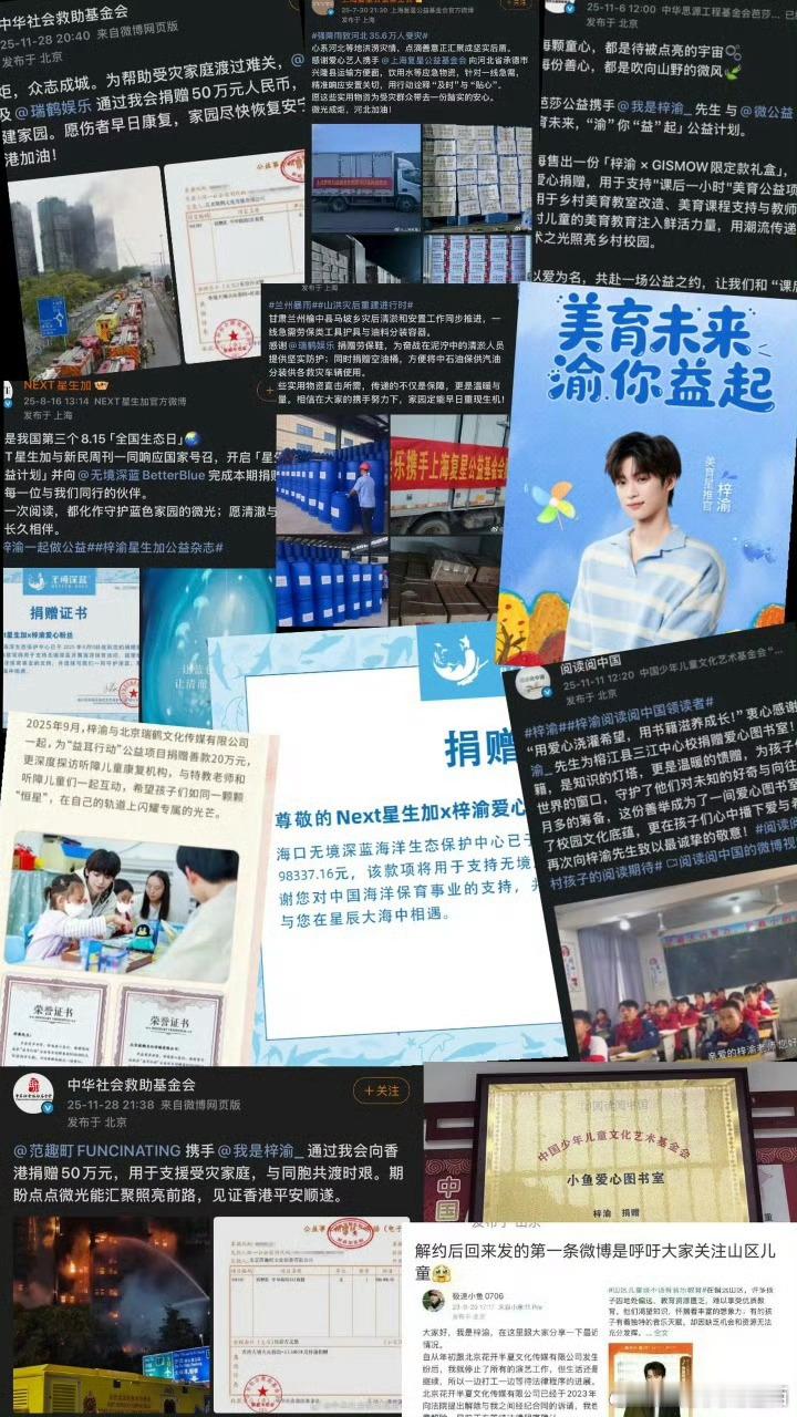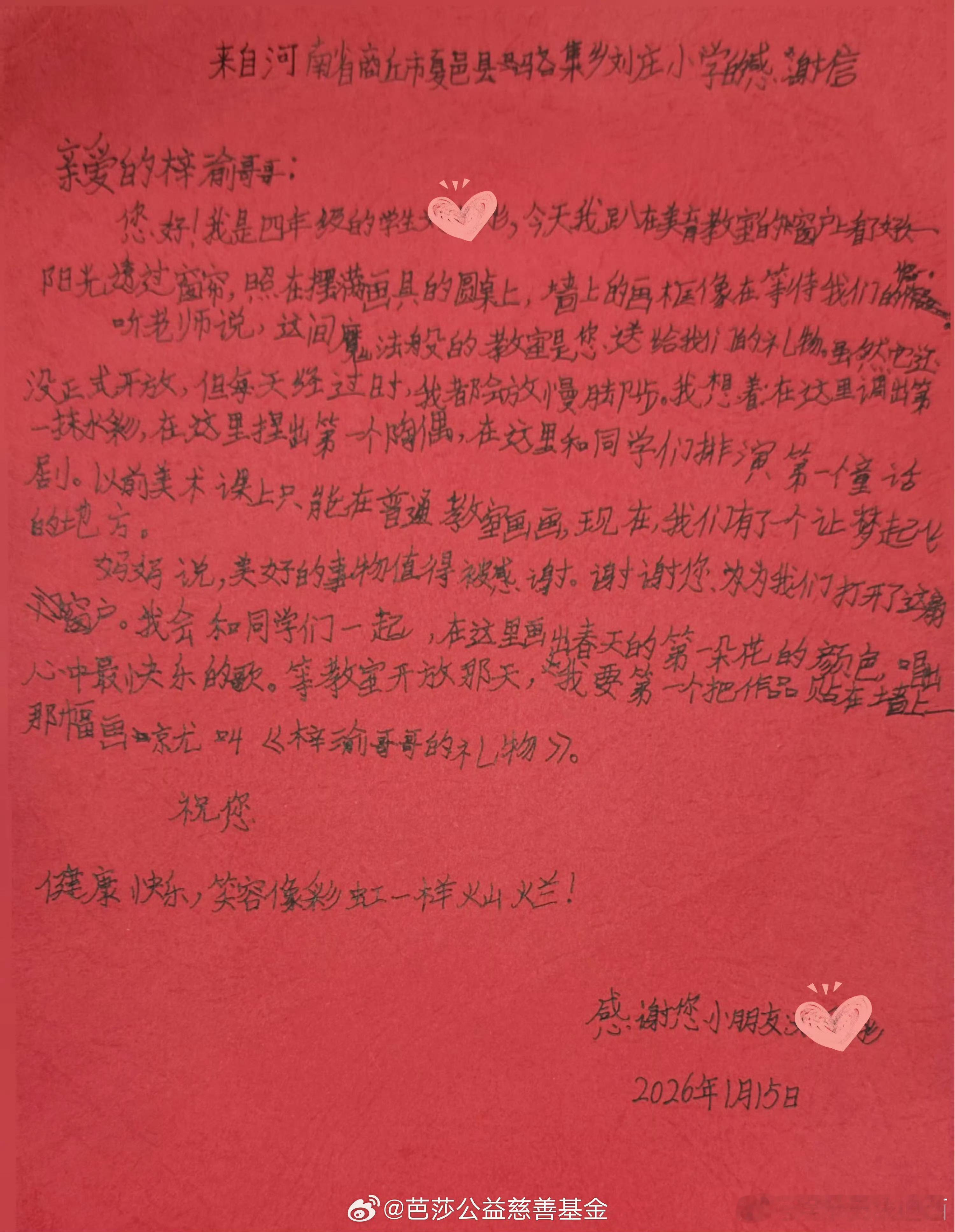 刘庄小学给梓渝的感谢信其实除了今天芭莎公益、微公益 、范趣町共同发起,梓渝先生的粉丝们共同捐赠改造的“美育教室”之外,梓渝自走红以来,在无人知晓的角落,始终默默践行公益,把走过的荆棘铺成坦途,短短几个月,羽翼未满第一时间就开始尽他所能,去照亮他人。