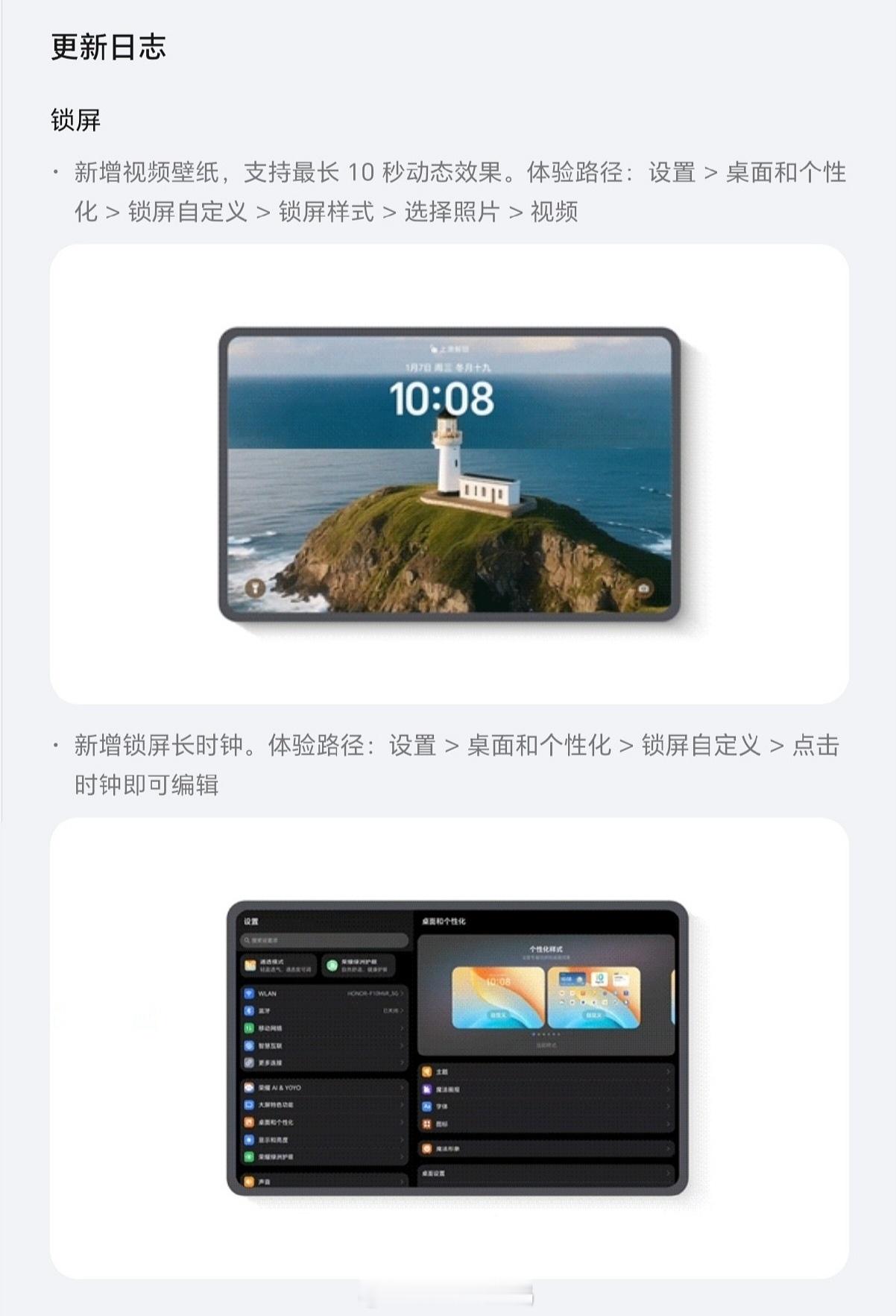 荣耀平板MagicPad 3/3Pro更新MagicOS 10.0.0.127系统,新增支持最长10秒的动态视频壁纸以及锁屏长时钟,PC级的WPS支持自由调节窗口化形式,优化浏览文档的滑动体验,新增了CAJViewerPC、中望CAD PC、万兴图示三个PC级应用,支持CAJ专业文献阅读、兼容DWG格式、CAD工程设计等全类型图形图表设计软件,平板生产力再飞跃!荣耀平板MagicOS10荣耀MagicOSMagicOS月月新