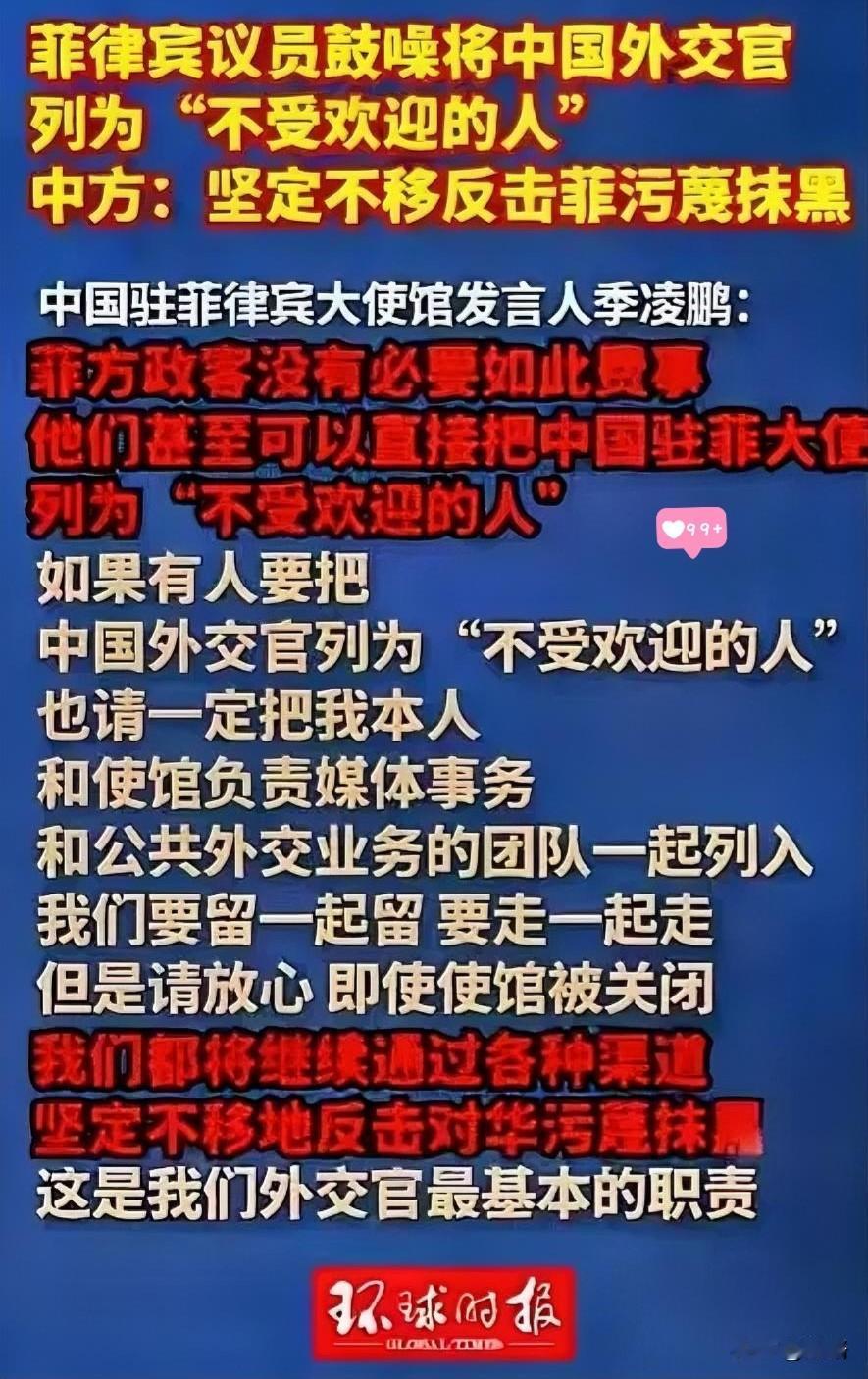对付菲律宾的无理取闹,东大不再含蓄! 1月28日,菲律宾15名参议员共同签署了一份涉华决议,旨在把大使馆副发言人因“不具备职业操守”列为“不受欢迎的人”。 结果刚刚到任不久的季大使直接表明态度,菲律宾没必要大费周章,如果有动作可以把整个团队一起列为“不受欢迎的人”,可以一起走人!但是,你们想通过这样方式污蔑抹黑,我们仍会通过各种渠道去反击,去打你们的脸! 这份所谓决议纯粹是场自导自演的政治闹剧。菲律宾参议院自己人都看不下去了,临时议长潘菲洛·拉克森当场泼了盆冷水:根据外交惯例,只有总统才有权宣布外国外交官“不受欢迎”,参议院根本没这权力。十五个人兴师动众签份没用的文件,就像揣着张假钞还硬要摆阔,场面着实尴尬。 中国外交官的骨头有多硬?季凌鹏发言人的话掷地有声:“如果有人要把中国外交官列为‘不受欢迎的人’,也请一定把我本人和使馆团队一起列入,我们要留一起留,要走一起走。” 这可不是气话,他更亮明了底牌:如果收到马科斯总统的离任通知,大使会立即离开,并为此感到无比骄傲与荣耀。这份担当背后,是“即使使馆被关闭,我们都将继续通过各种渠道坚定不移地反击对华污蔑抹黑”的铮铮誓言。 某些菲律宾政客的戏码越演越离谱,已经到了忘恩负义的地步。去年12月25日,中国海军在南海巡航时救助了一名遇险的菲律宾渔民,并协调菲海警助其安全返航。这本是展现人性温暖的善举,到了菲海警发言人塔里埃拉嘴里,却成了“政治宣传”。救人反被诬陷,这种倒打一耙的逻辑,寒了多少人的心。 塔里埃拉之流的表演绝非偶然。有数据统计,仅2025年一年,他就在社交媒体上发布了195条攻击抹黑中国的帖文。谎言重复千遍也不会成为真理,只会暴露编造者的心虚与狂躁。他们四处“摇人”壮胆,像极了吵不过就喊家长的孩子,殊不知国际社会看的都是事实和道理。 这股歪风正在让菲律宾付出真金白银的代价。疫情前,中菲每周有300多班直航,如今锐减到只剩84班。两国人员往来从每年300多万骤降至30万,中国对菲投资也远低于其他东盟国家。当邻国都在与中国共享发展机遇时,菲律宾却因政客的短视炒作,眼睁睁看着机会溜走。 中国驻菲使馆的大门始终为友谊与合作敞开。井泉大使到任后,足迹遍布菲律宾各地,从出席教育基金颁奖到走访中吕宋地区,积极推动双边务实合作。中方援助建设的大桥、捐赠的救灾物资、提供的疫苗,都是两国友好的见证。我们推动合作是真心的,但捍卫尊严更是坚定的。 《维也纳外交关系公约》赋予外交官阐明本国立场、反驳无端攻击的权利。中国使馆的每一次回应,都是在用事实戳破谎言。我们欢迎建设性对话,但对那些“说假话、肆意抹黑、散布仇恨”的行为,绝不会姑息忍耐。这就是我们的底线。 奉劝那些沉迷于政治操弄的菲律宾政客,该醒醒了。靠着煽动对抗赚取政治筹码,最终只会让国家利益受损,让民众福祉买单。中国有句古话:得道多助,失道寡助。把邻居当成假想敌整天咒骂,远不如坐下来聊聊合作来得实在。 朋友来了有好酒,豺狼来了有猎枪。中国外交官站在捍卫国家利益的第一线,他们的底气来自国家的强大,他们的坚守源于人民的信任。任何抹黑与打压,都只会让他们更加团结,让他们的立场更加坚定。 各位读者你们怎么看?欢迎在评论区讨论。菲律宾挑衅 菲律宾争端 菲律宾风波 菲方表态 菲方言论 菲律宾外长 菲律宾论坛