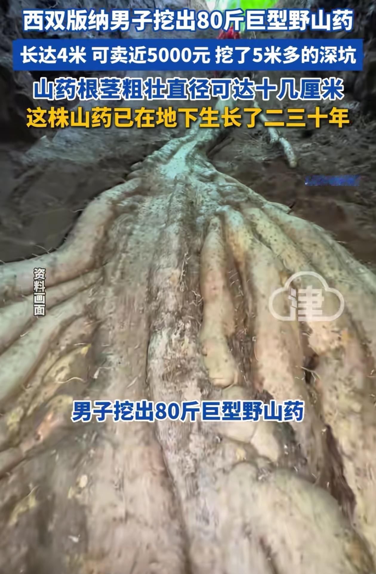 活久见!云南西双版纳,男子和同伴上山挖山药,发现一根“巨型山药王”,两个人愣是花了4天时间,才把这根80斤的山药挖了出来。网友:“不如拿来做成标本!” 从来没想过,一根山药竟然能长这么大。 男子一行人都是在挖山药的老行家了,但像这么大的,也是头一次见。当时发现山药后,几个人为了不破坏它的根茎,就绕着它周围挖起了深坑。 谁知这一挖就是好几天,最后挖了差不多五米的深坑,山药的根尖才彻底露了出来。几个人拿出测量工具一量,发现这山药的根茎可真够粗壮的,不仅平均直径有十几厘米,而且最粗的地方就有差不多半米,这个头确实不小。 几个人猜测,这山药至少得在地下埋了二三十年,长时间的吸收营养再加上不容易被人发现,才让它有机会长这么大。 遗憾的是,野生山药并不是越大越好,根据研究发现,体型越大的山药口感反而越差,如果拿来吃真的不合适。 而且只按重量卖的话,最多也只能卖五千,其实并没有想象中值钱。 不过这种山药应该有很高的药用价值和研究价值,无论是做中药还是做标本都是不错的选择。 看到这么大的山药,有网友感叹云南这地方真是块宝地,不管什么动植物都能长得粗粗壮壮的。也有网友惊叹,一颗山药要吸收二三十年的日月精华才能长这么大,真的不容易。 如果不是被人为打扰了,也许这根山药还会一直藏在这里,继续生长下去。现在是四五米多,再过几十年甚至几百年,真有可能长出来一个巨无霸! (信息来源:津云) 男子挖出巨型野山药 长4米重80斤