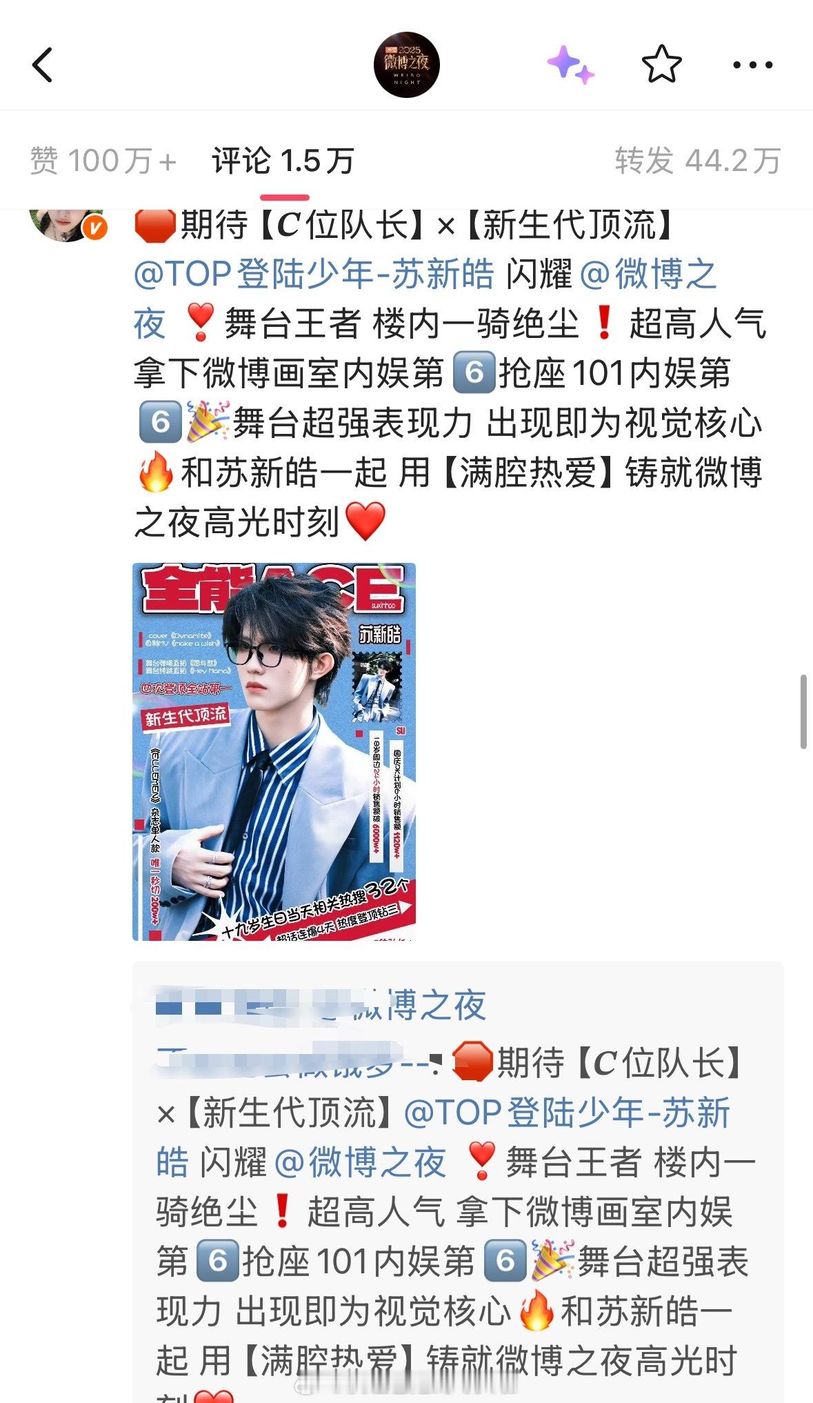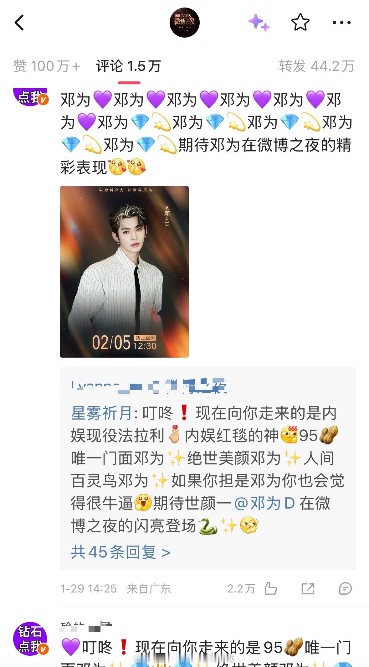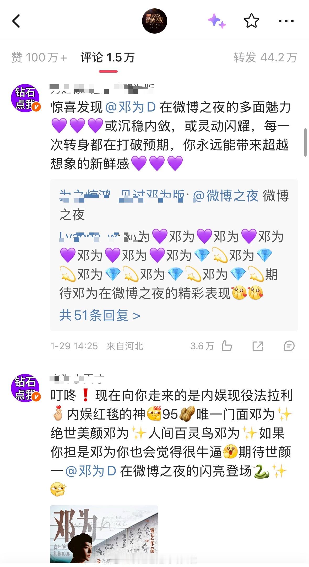 微博之夜 第三波阵容官宣博内赞超了100万!大眼上活粉还是多前十里邓为粉占6,丁禹兮粉占2,苏新皓粉占2微博之夜第三波阵容