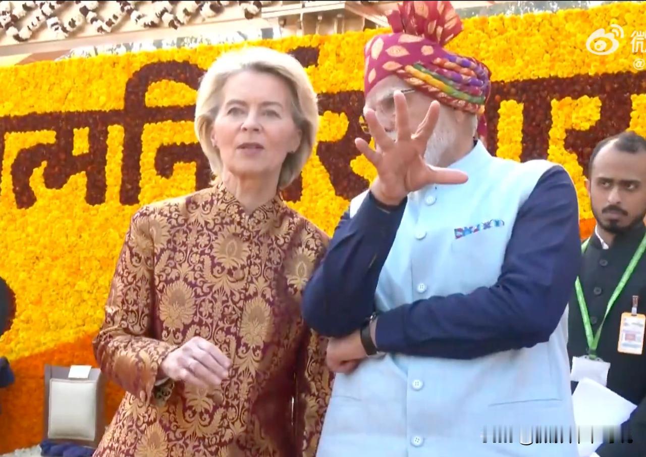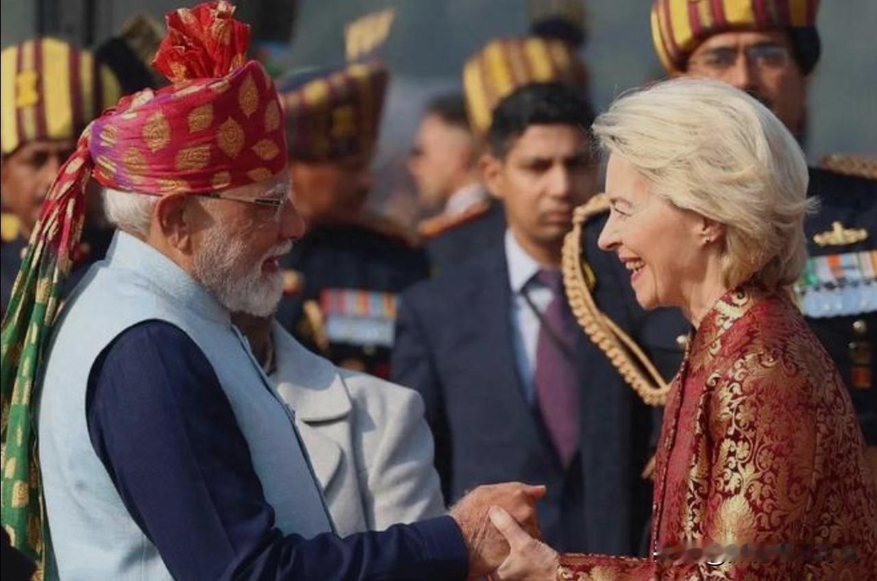 冯德莱恩这次去参加印度阅兵式时穿的服装很有意思,既不像是欧洲或者国际通用服饰,也不是印度风格服饰,而穿的那件外套更像是新中式风格的。比如立领、红底搭配金色图案、丝绸缎面和类似中式纹案,如果大家对唐装或者秀禾装比较熟悉,那就一定能看出其中的门道。那么问题来了,在如此正式和隆重的国际社交场合,这样穿衣服绝对不是随意而为之的,是不是在暗示着什么?