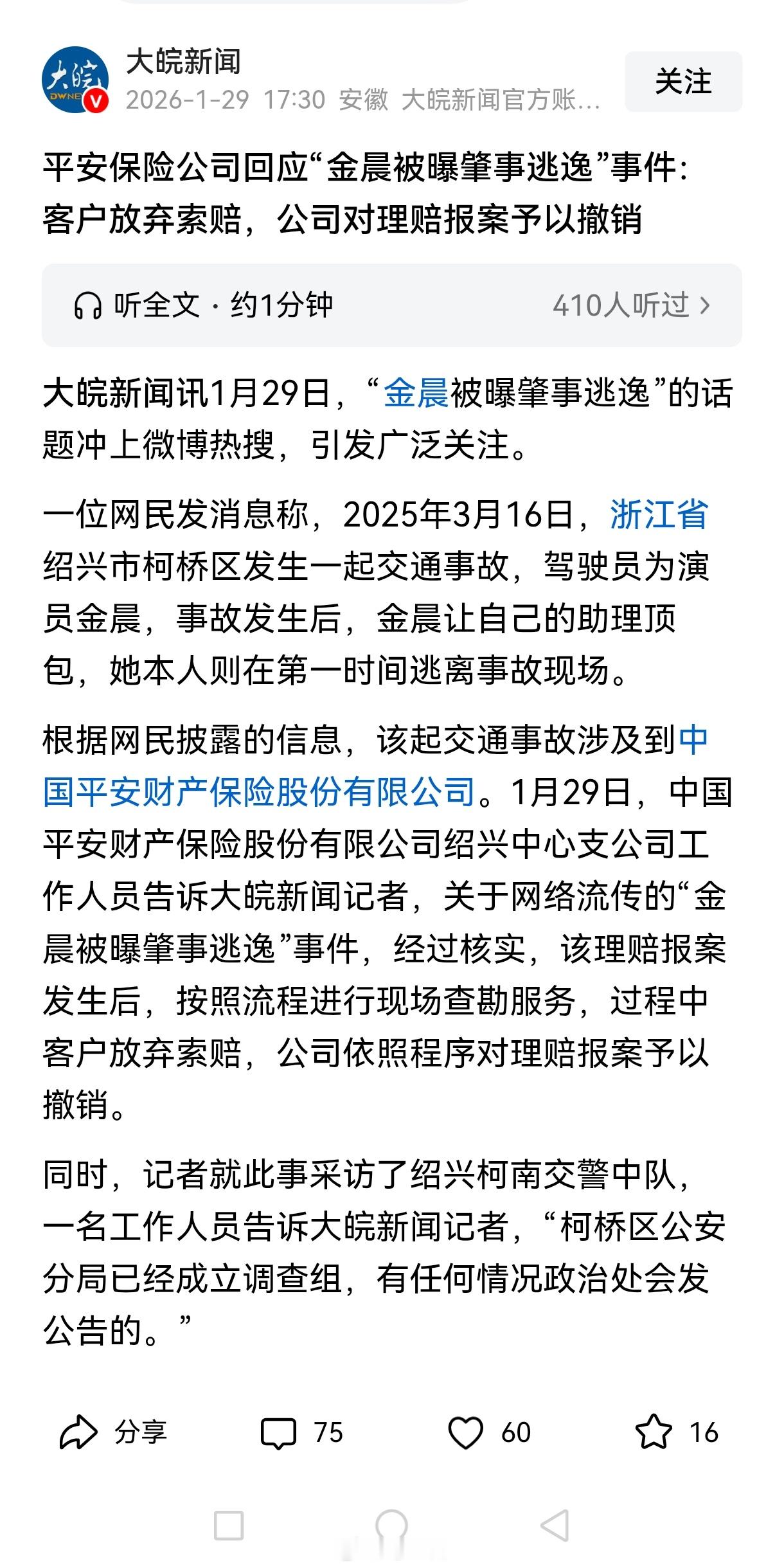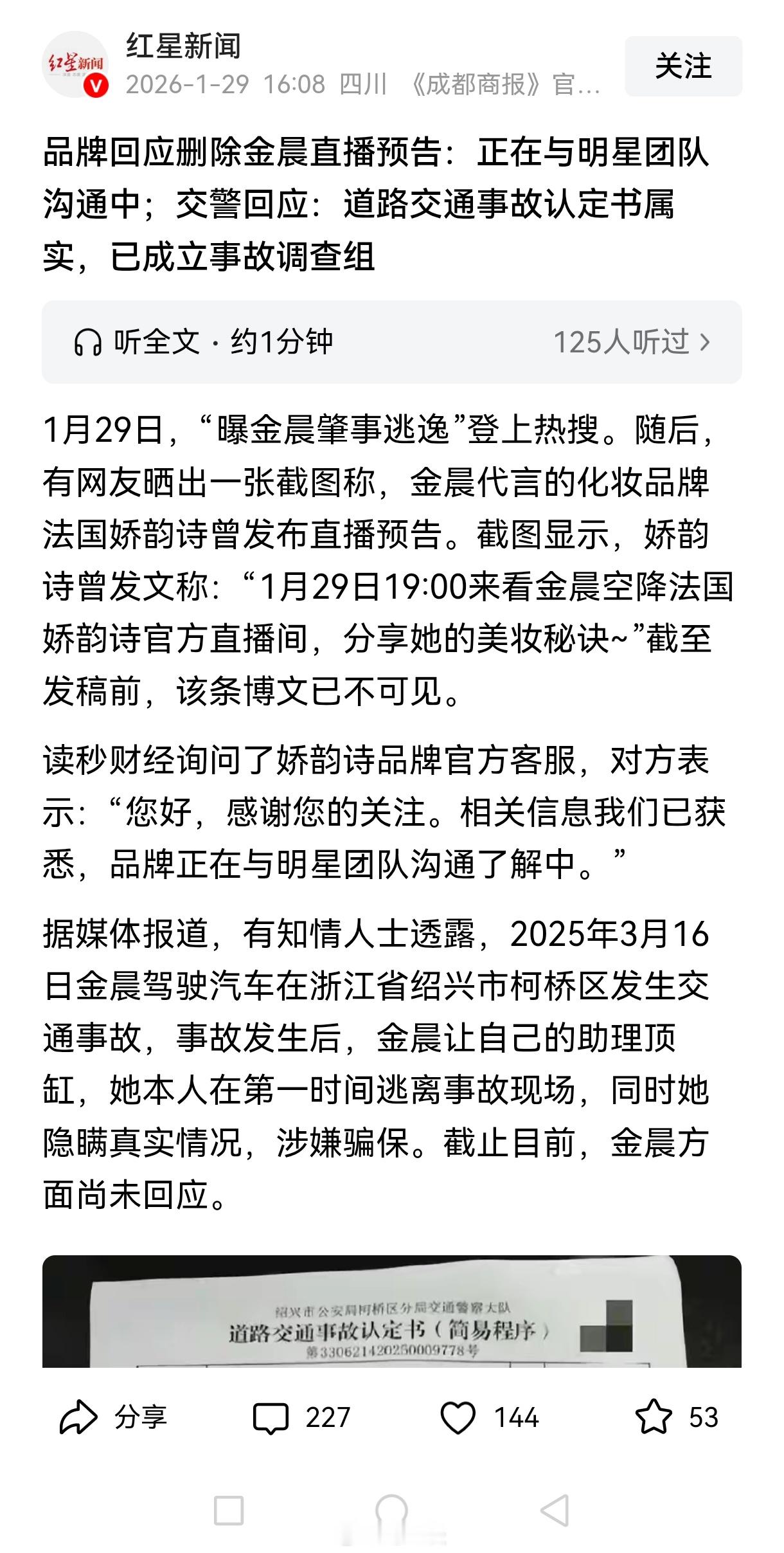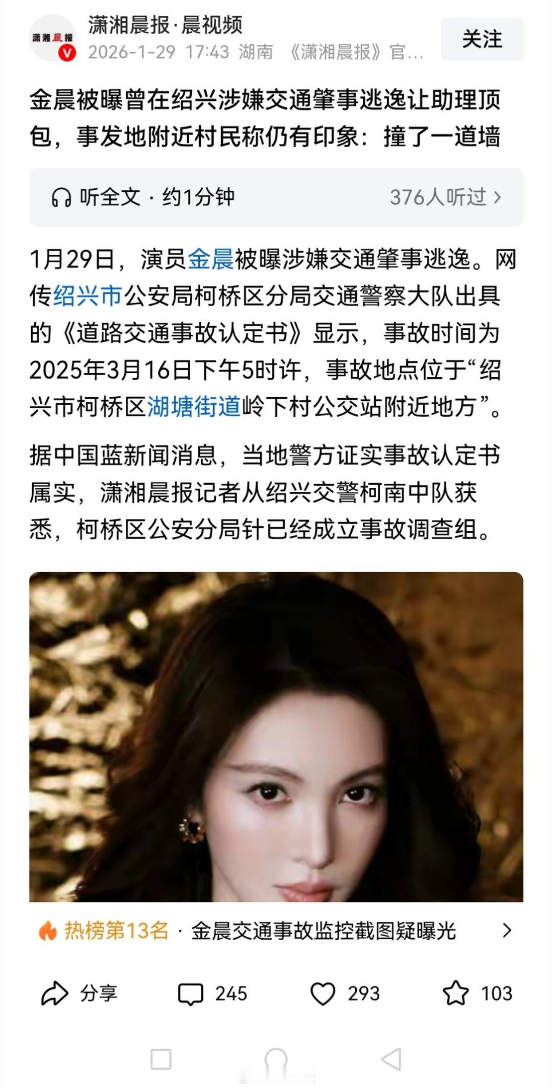明星金晨被曝肇事逃逸让助理顶包引发全网关注,事发地附近村民称仍有印象:撞了一道墙。截图是网传狗仔爆料金晨的原因。明明是一个小事故,为啥要找助理顶包?是嫌麻烦?涉嫌酒驾?这也太草率了。如果坐实交通事故后逃逸,将被处以罚款,甚至拘留并吊销驾驶证等行政处罚。另一方面,若找人顶包属实,金晨可能被刑责,顶包者可能构成包庇罪,甚至会被判刑。截至目前,金晨本人及工作室未对此事作出回应。品牌回应删除金晨直播预告:正在与明星团队沟通中;交警回应:道路交通事故认定书属实,已成立事故调查组。平安保险公司回应“金晨被曝肇事逃逸”事件:客户放弃索赔,公司对理赔报案予以撤销。曝金晨肇事逃逸曝金晨交通事故监控截图