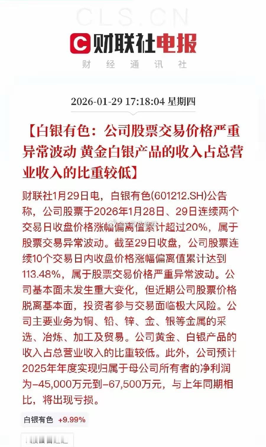贵金属燃爆,降温来了!行啦吧,再让你们疯狂炒白银,黄金!利空来了,!说到就到,来给你降降温!最近这几天黄金,白银概念股,火爆全球,尤其是在我们二级市场人气爆棚!各路游资大佬,机构,纷纷杀入!今天白银有色竟然拉出了八个涨停,这真是逆天的盘,股民纷纷追涨,公司连忙出来发布公告,给它降温!估计明天在想涨停概率已经不错在,也不要随便去抄底,散户想挣钱必须等回调机会!毕竟这里汇集了大量获利盘!