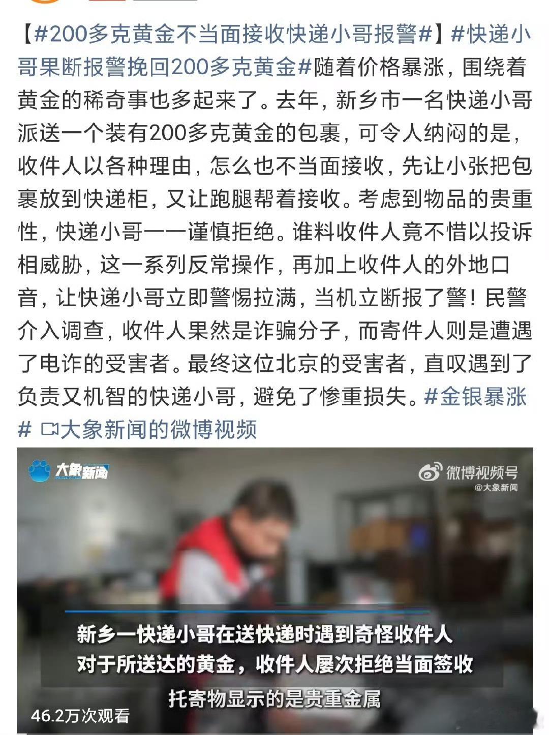 200多克黄金不当面接收快递小哥报警快递小哥真的是明白人200多克黄金相当于20多万居然不敢露面拿让放快递柜肯定有蹊跷