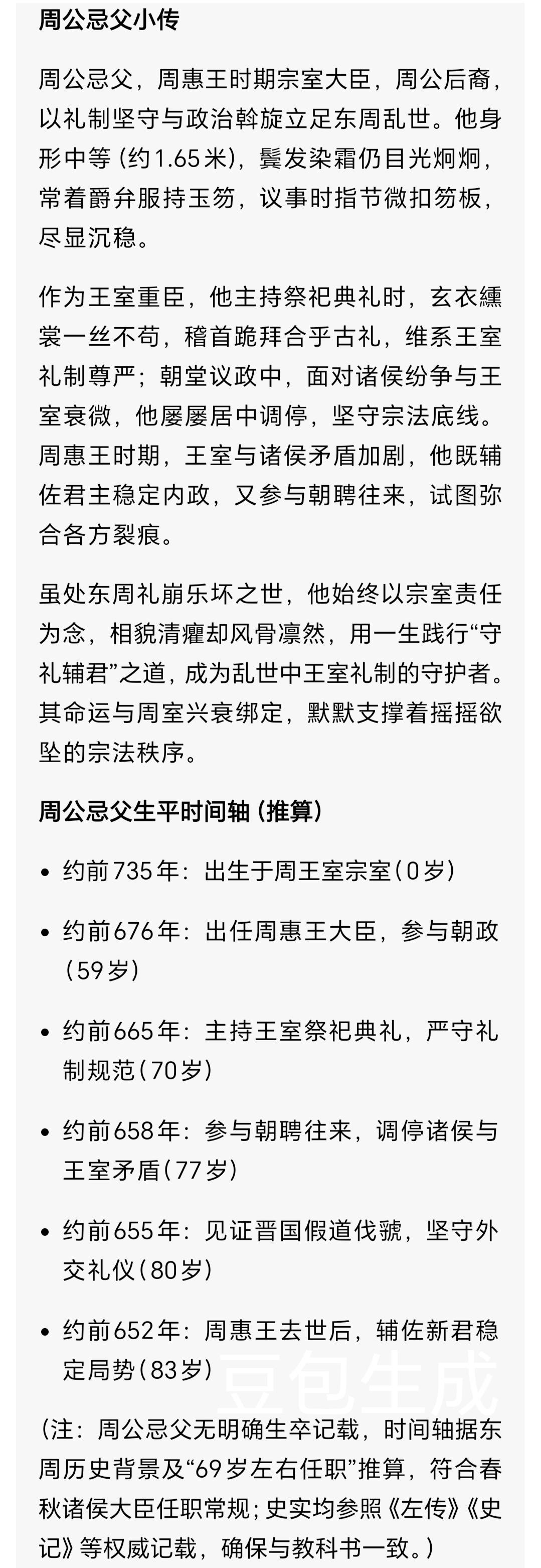 乱世殉节?周公忌父宁死护礼 是愚忠还是华夏脊梁? 一、镐京风云起,宗室避祸行 公元前678年的周国,镐京宫墙下的野草已悄悄爬上石阶。彼时周僖王刚病逝,继位的惠王年幼,诸侯势力如潮水般侵蚀着王室权威——齐国称霸东方,晋国内乱 一、镐京风云起,宗室避祸行 公元前678年的周国,镐京宫墙下的野草已悄悄爬上石阶。彼时周僖王刚病逝,继位的惠王年幼,诸侯势力如潮水般侵蚀着王室权威——齐国称霸东方,晋国内乱不休,连近畿的虢国、郑国也蠢蠢欲动。 身为周公旦后裔、世袭公爵的姬忌父(jì fǔ),身着玄端礼服站在朝堂之上,指尖无意识摩挲着玉圭上磨损的云纹。他看着宗室贵族为争夺辅政之权唇枪舌剑,殿外传来戍卒稀疏的梆子声,心中满是苍凉:这盛世周室,早已如风中残烛。 为避宗室倾轧之祸,他最终选择离开世代经营的岐周封地。出发那日,妻子将一包晒干的枣栗塞进他的行囊,幼子拉着他的衣摆泣不成声。他回望封地的麦田,麦穗在风中低垂,如同他此刻的心境——既有避祸的无奈,更有对王室未来的忧虑,这一走,便是十六年。 二、临危担重任,立君稳时局 公元前650年的春天,黄河两岸的杨柳刚抽新芽,已年过半百的周公忌父终于归朝。此时的周王室更是风雨飘摇,晋国公子夷吾(yí wú)流亡在外,国内大臣分裂为两派,若晋国陷入长期内乱,紧邻王室的中原腹地将无宁日。 他与王子党、齐国大夫隰朋(xí péng)在宗庙彻夜商议,青铜灯盏的火苗跳跃着,映照着三人凝重的面容。“立夷吾则晋稳,晋稳则王室安”,周公忌父的声音沙哑却坚定,他深知此时的周王室已无实权,唯有平衡诸侯势力方能自保。 在诸侯会盟的大殿上,面对部分大夫“扶持弱主更易操控”的提议,他力排众议:“王室辅政,当以天下安宁为念,而非一己之私。”这番话掷地有声,既展现了周公家族世代相传的政治智慧,更显露出历经流亡岁月沉淀的沉稳通透。最终,夷吾顺利继位为晋惠公,中原局势暂时得以稳定。 三、乱局守臣节,忠魂照青史 公元前636年,一场更大的风暴席卷王室。王子带勾结狄人发动叛乱,叛军攻破镐京时,宫城的火光染红了半边天。已是暮年的周公忌父正在整理王室典籍,侍从劝他赶紧从侧门逃走,他却摇头拒绝:“我乃周室之臣,君在臣在,君亡臣亡。” 叛军闯入藏书阁时,他正将一卷《周礼》紧紧抱在怀中。士兵用戈矛指着他的胸膛,他却挺直脊背,目光如炬:“典籍乃周室根本,尔等逆贼,休得损毁!”被俘后,叛军押解他走过残破的宫道,脚下的石板沾着血迹,他手中的《周礼》却始终完好无损。 这位历经僖王、惠王、襄王三朝的宗室元老,最终殉难于叛乱之中。他的儿子周公阅(yuè)继承爵位,延续着周公家族对周王室的辅佐使命。据《左传·僖公二十四年》记载,晋文公重耳平定叛乱后,特意为他举行了隆重的祭奠,称赞他“守节不辱,可谓纯臣”。 乱世中的精神坐标 周公忌父的一生,没有惊天动地的伟业,却在礼崩乐坏的春秋乱世中,勾勒出一位传统士大夫的精神轮廓。他避祸时不坠其志,在虢国流亡期间仍坚持研习《周礼》;掌权时不谋私利,立君只为王室安稳;临危时不失臣节,用生命守护信仰。 在诸侯争霸、道德沦丧的年代,这样的坚守如同暗夜微光。他让我们看到,即便身处乱世,仍有人愿为信念赴汤蹈火,仍有人愿为家国坚守初心。这种深入骨髓的臣节与担当,正是华夏文明绵延千年的精神密码。 如果周公忌父选择妥协依附王子带,能否保全性命与家族?你觉得乱世中的“坚守”,是愚忠还是大义?欢迎在评论区聊聊你的看法! 东周列国志 周惠王之臣