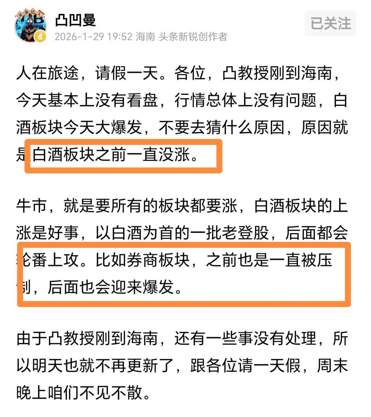 看好老登股!凸教授深夜发文,白酒大涨的原因,主要是因为前期一直没涨,也说明没涨的老登股还有机会,券商和白酒一样,也一直被压制了,后面也会向白酒一样突然暴涨起来,低估板块会轮番上涨,因为这就是牛市来了!
