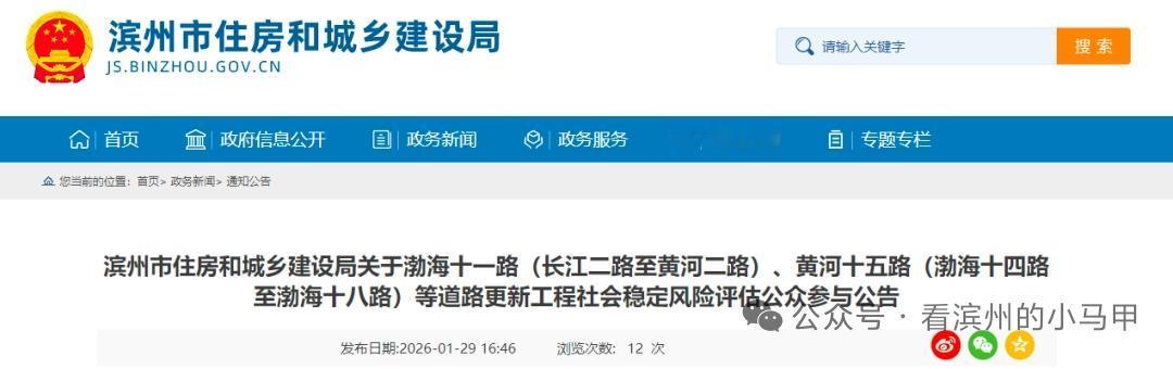 滨州计划修路!涉及渤11、黄15 山东滨州滨城区计划实施渤海十一路、黄河十五路两条道路更新工程,相关社会稳定风险评估工作正公开征求公众意见建议。 项目由滨州市市政公用发展服务中心建设,总投资约620万元,2026年4-10月施工,主要对涉事路段老旧道路做面层更新,涉渤海十一路(长江二路至黄河二路、黄河五路至黄河八路)、黄河十五路(渤海十四路至渤海十八路)及黄河十五路以北相关路段。 来源 综合滨州市住建局
