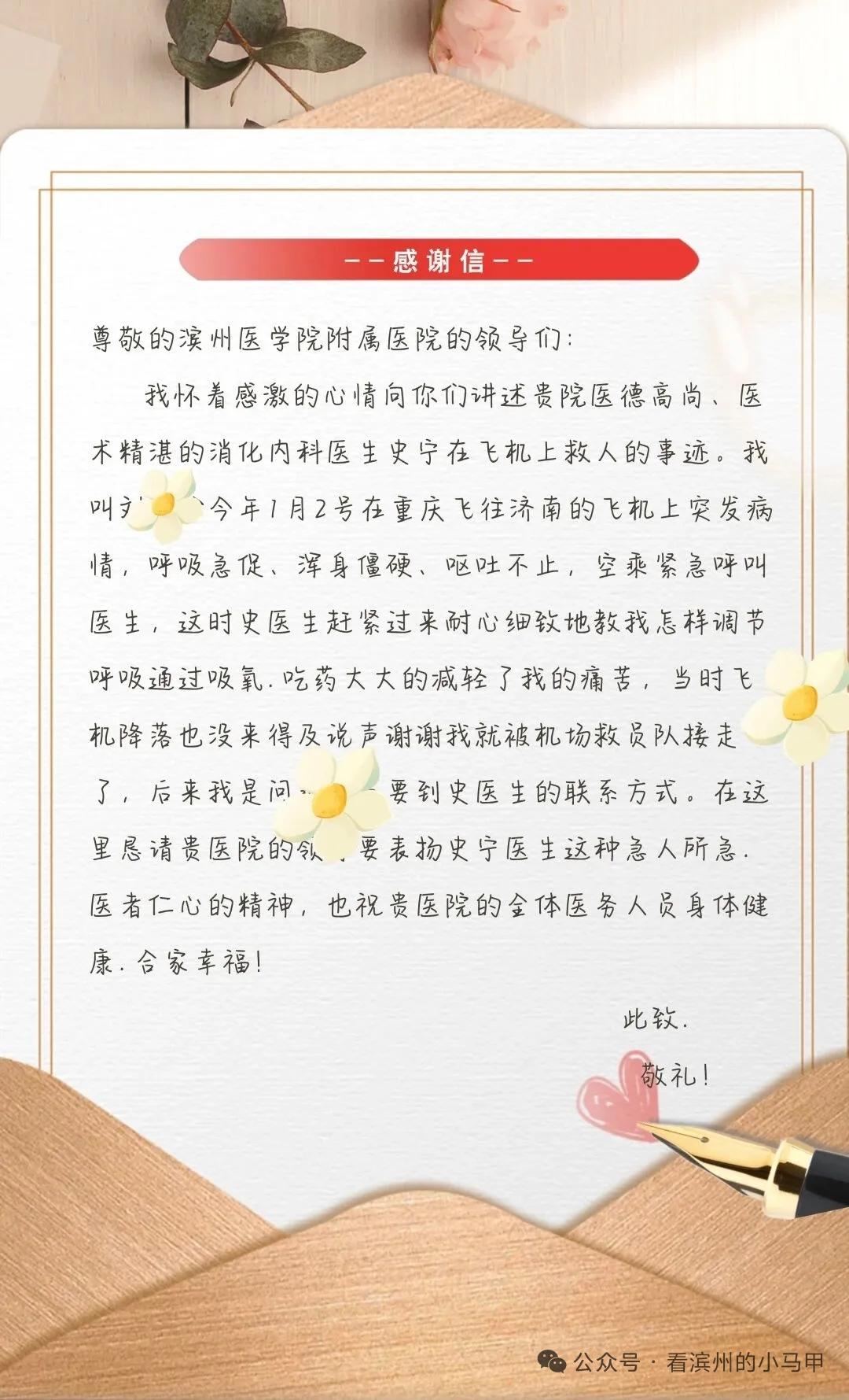 女医师万米高空紧急救援突发患者获赞誉 山东滨州医学院附属医院消化内科史宁主任医师获淄博刘女士送来的感谢信与锦旗,感谢其万米高空的紧急救援。 1月2日,刘女士在重庆飞济南的航班上突发呼吸急促、呕吐不止等急症,史宁医师闻声挺身而出,快速检查排除心梗,精准处置并安排吸氧、含服硝酸甘油,还全程温柔安抚患者。她与空乘坚守旁侧40余分钟,直至患者病情好转、体征稳定。飞机落地后刘女士被送医检查无大碍,几经打听找到史宁医师的联系方式,特意送上感谢,称赞其医者仁心。 史宁医师的善举也诠释了医者的大爱与担当。