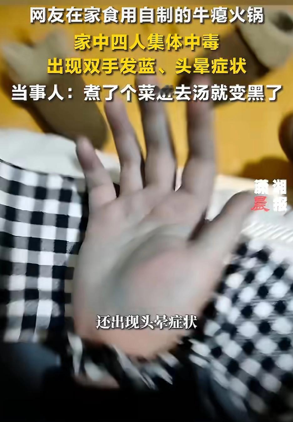 怎么什么都敢吃啊,差点害了一家人。 吃牛瘪火锅已经是有超于常人的意志力了并且还是自制的,还敢加自己都不认识的菜进去,汤底颜色都变了,居然还敢吃,这不是黑暗料理是什么?这个火锅咱是非吃不可吗? 这下好了,一家人吃的双手发蓝,上吐下泻,头晕不止,这不是纯粹给自己找罪受,又不是正常火锅不能吃,正常的菜不能涮,这也告诉我们不认识的东西千万别乱吃,否则就很有可能应了那句话“红伞伞,蓝杆杆,吃完一起躺板板。”
