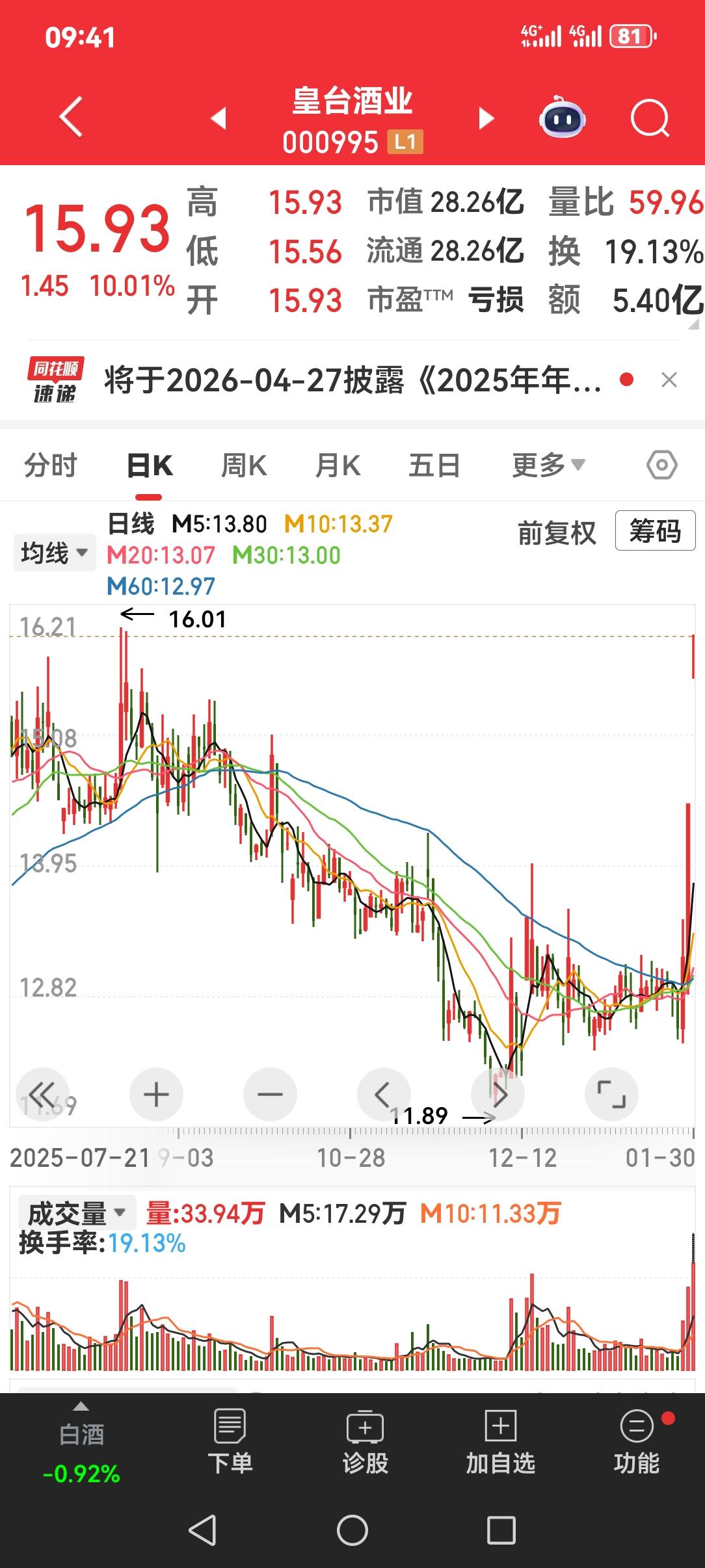 白酒股的躁动就是反弹,别的不说,就讲这次带头的是皇台酒业。 那皇台酒业并非它的名字有个“皇”字就可以称王称霸,其财务数据真不怎么样!每股净资产不足一元,年营收不到三亿元,这很不好。人家硬性规定:年营收不足三亿元且亏损,要戴上ST帽子。咱就问你,今后几年年营业额与业绩怎么样? 那为什么会成为白酒股行情领头大哥?个人估计是主力资金没有从它身上全身而退,每一次行情都是请散户进来的机会。 还有一个细节可以说一下,干嘛发动行情选在下午,无非小半天时间短,封板成本低。昨天白酒看似走牛,总觉得行情对指数没什么大作用,沪深指数并没有同步白酒收出个像样的日线。