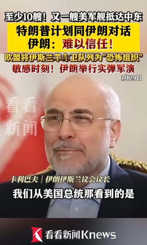 中东彻底炸锅了,29日前后一波接一波的狠操作直接把地区紧张感拉到顶点,美军秀肌肉、欧盟乱站队、伊朗亮底牌,特朗普想当“和事佬”,却被伊朗当面怼到没脾气,这出大戏看得人直呼刺激。 美军这波操作是真狠,1月28日“德尔伯特·D·布莱克”号驱逐舰刚穿过苏伊士运河冲进波斯湾,美军在中东的军舰直接凑齐至少10艘,明摆着是来耀武扬威、搞军事威慑的,生怕中东的火不够旺。 这边美军军舰刚摆好架势,特朗普就跳出来搅局,放话要跟伊朗对话,结果伊朗压根不买账,伊斯兰议会议长卡利巴夫29日直接公开硬刚:现在的特朗普,根本信不过! 还直言想谈判可以,先把伊朗的经济利益实打实保障好,别想拿一堆苛刻条件逼伊朗妥协,美方那套“霸王条款”,伊朗坚决不吃! 不仅如此,欧盟也跟着瞎掺和,完全跟着美以的节奏走,1月29日27国外长全票拍板,直接把伊朗伊斯兰革命卫队扣上“恐怖组织”的帽子,还顺带制裁了15名伊朗官员和6个实体。 这下伊朗当场怒了,怒斥欧盟这是非法行为,革命卫队是正经的反恐武装力量,欧盟就是被美以牵着鼻子走,纯属没事找事、火上浇油! 如今中东这根弦已经绷到了极限,美军舰、欧盟制裁、伊朗军演,三方较劲谁也不肯退一步,再这么僵持下去,冲突随时可能一触即发,最后遭殃的还是普通老百姓, 只希望各方能赶紧冷静下来,别拿地区和平当赌注,不然真打起来,没有任何一方能讨到好处!
