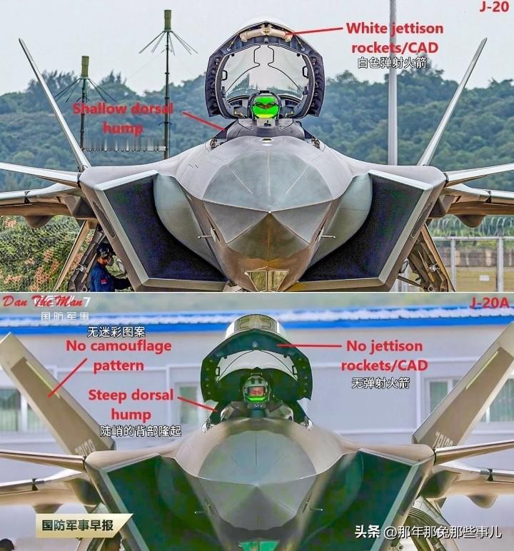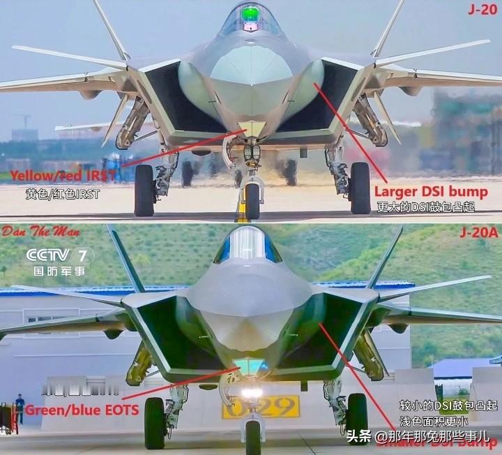 歼20A与歼20同角度,蓝绿色EOTS在质感上了个大台阶.. 歼20A背部隆起更陡峭,DSI鼓包也明显更大,还多了白色弹射火箭,整体质感比歼20上了个大台阶。 核心升级在光电系统,歼20装的是黄色/红色IRST光电搜索系统,只能单向搜目标,没法直接引导打击。歼20A换成了绿蓝色EOTS光电瞄准系统,不仅能搜,还能直接导引导弹攻击,对陆对海打击能力直接拉满。 早期歼20的EOTS透镜泛金色,里面有增强隐身的金属丝线。歼20A用的是蓝宝石玻璃罩,泛着冷冽蓝光,强度更高还能做更大尺寸,里面的红外传感器孔径也跟着变大,探测隐身目标的距离和精度都提升不少。 有消息说歼20A的EOTS还融入了分布式光电孔径系统,能全向搜索,这和歼20双座型、“大银杏叶”验证机的技术路线能对上。从外观到核心系统的全面升级,能看出歼20系列一直在迭代优化。