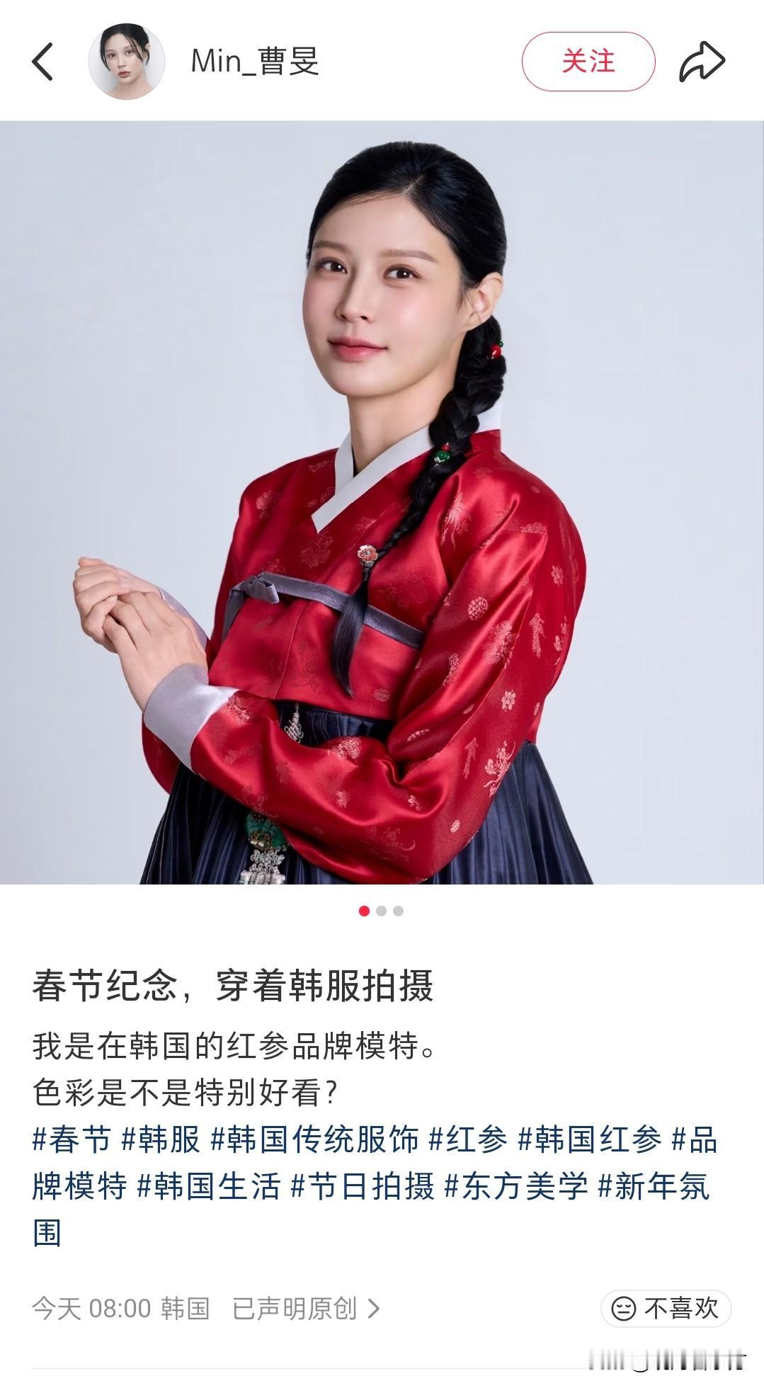 韩国第二大在野党祖国革新党党首曹国女儿曹旻(过去音译为“曹敏”,现在更正)今天在社交媒体上发帖公开为春节拍摄的照片——人家说了是“春节”,没说农历新年。其实九十年代以前,我们自己在官方新闻报道里经常说“农历新年”,“春节”这两个字真正诞生在民国时期。