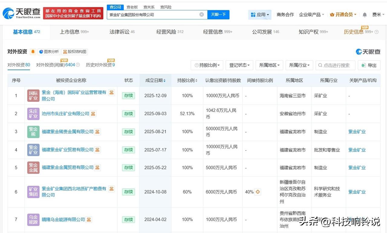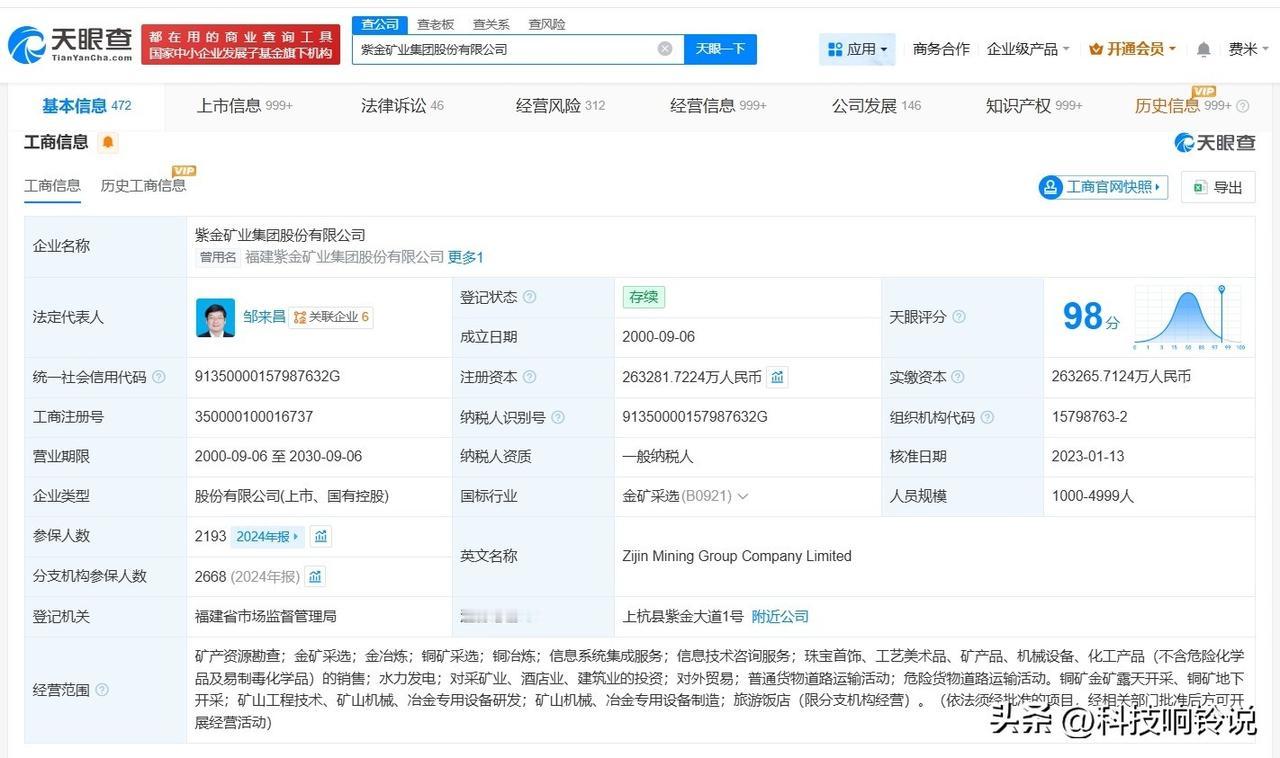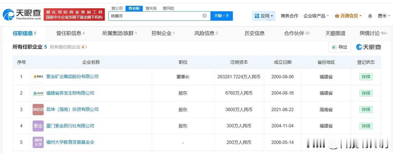 【紫金矿业创始人名下关联5家企业 紫金矿业创始人商业版图盘点 紫金矿业去年成立多家新公司】紫金矿业创始人泪洒现场 紫金矿业创始人称西方公司搞不过我们 据媒体报道,近日,紫金矿业创始人陈景河公开表示公司市值被严重低估,引起市场广泛关注。他认为,分拆上市的黄金板块市值已超过集团总市值的40%,但仅占集团20%的利润和50%的黄金储量,加上金属价格大涨和产能扩张,公司的增长潜力未充分体现。 天眼查App显示,陈景河名下关联5家存续企业,包括紫金矿业集团股份有限公司、福建省养宝生物有限公司、福州大学教育发展基金会等,陈景河在上述公司担任理事或者持有股份。 值得一提的是,紫金矿业集团股份有限公司成立于2000年9月,法定代表人为邹来昌,注册资本约26.3亿人民币,经营范围包括矿产资源勘查、金矿采选、金冶炼等,由闽西兴杭国有资产投资经营有限公司、香港中央结算(代理人)有限公司、中国证券金融股份有限公司等共同持股。对外投资信息显示,该公司对外投资80家企业,其中60余家处于存续状态。值得一提的是,2025年,该公司已成立紫金(海南)国际矿业运营管理有限公司、池州市朱庄矿业有限公司等多家新公司。 天眼查信息:-c7513816