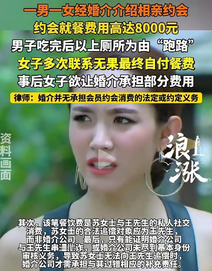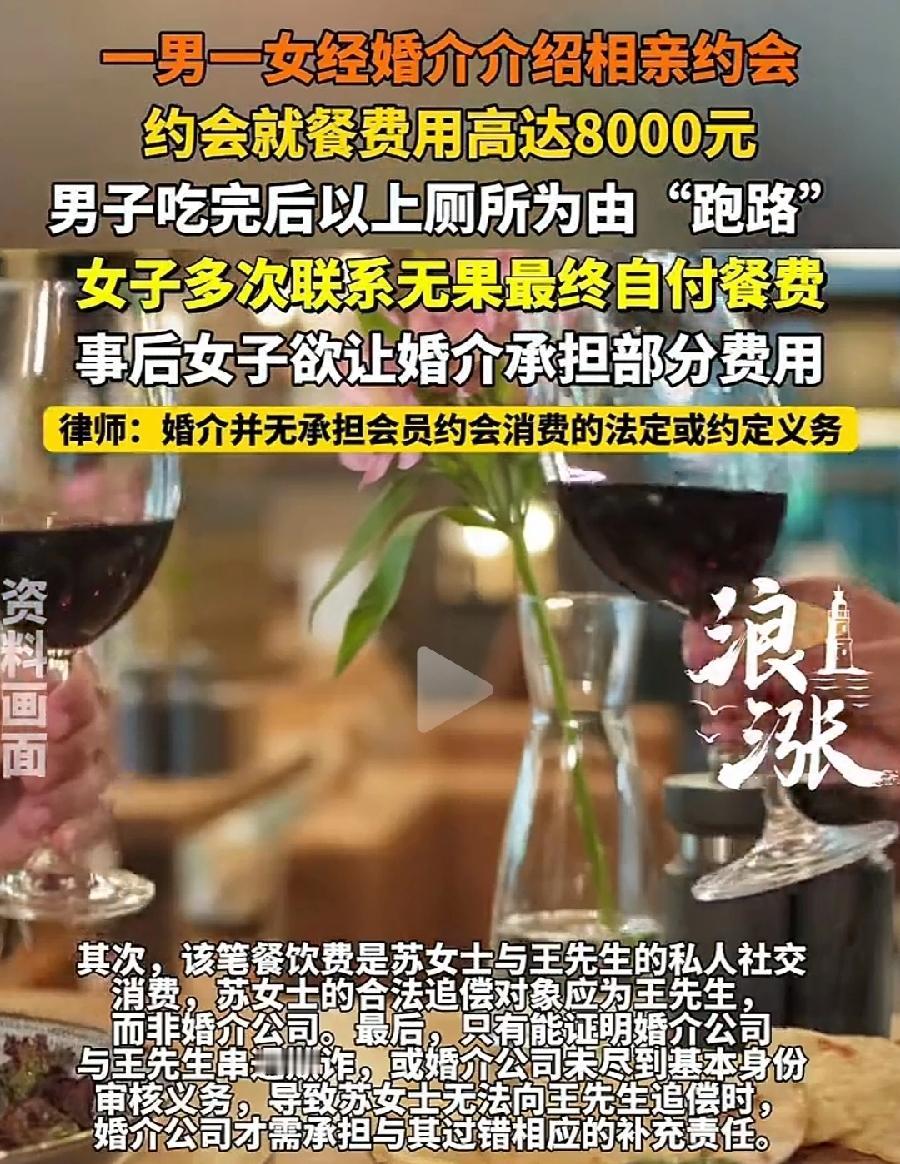 相亲点餐8000元男子上厕所跑路逃单!问题是,到底谁点的餐?吃这么多钱?天价饭局,不会是饭托、酒托吧?正常情况下,男女相亲,都是女方点菜,男方付钱,所以女方嫌疑可能性比较大!而且现在男方失联找不到人,女方找律师起诉,打算让婚介公司付钱,这更像是饭托了,看后续!如果真是女方,再次警示每一个单身男同胞,特别是大龄男同胞,别为了急着找媳妇,被别人坑了当冤大头!