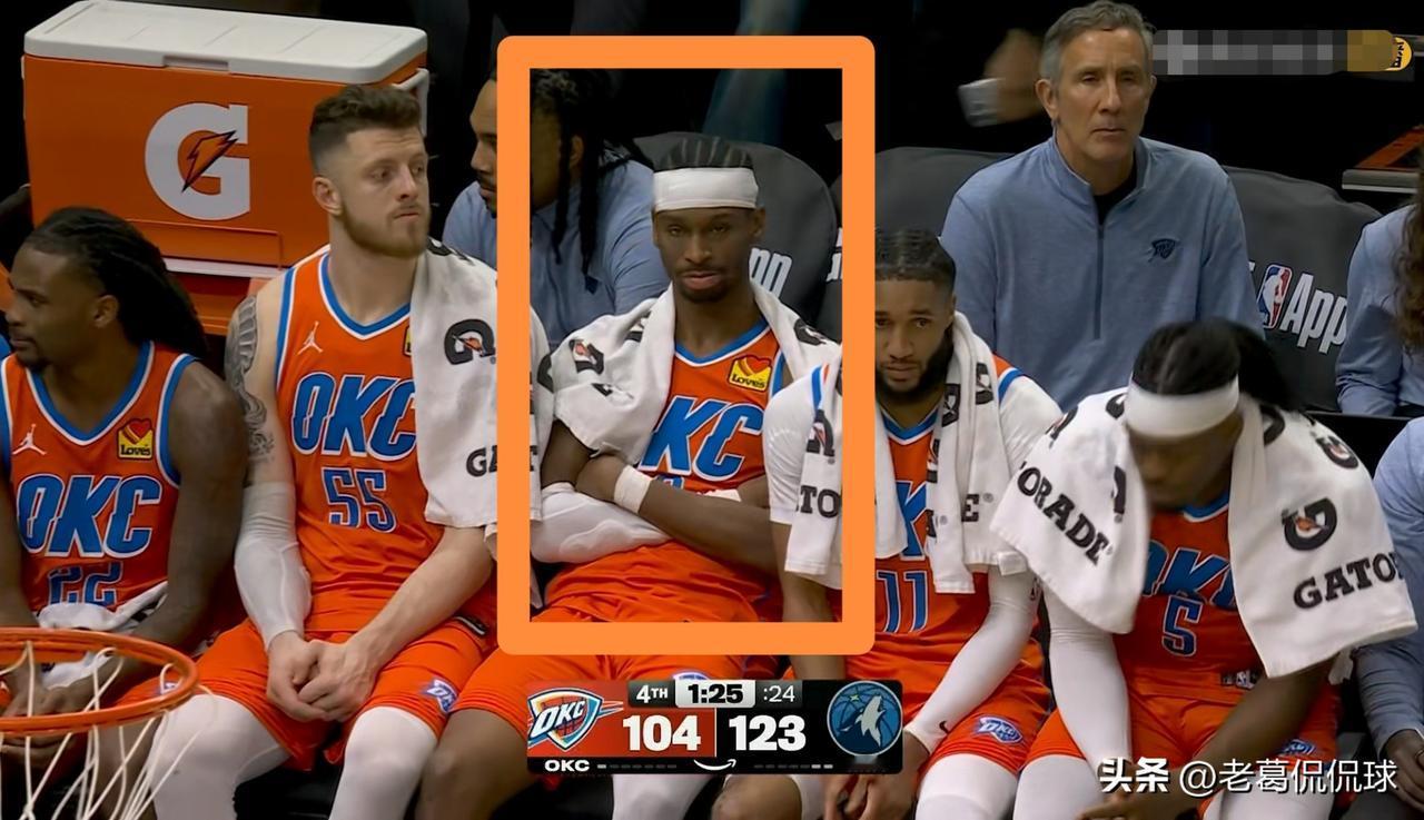 雷霆超级巨星亚历山大真是太失落了!在今天雷霆客场挑战森林狼的比赛中,当时距离全场比赛结束还剩最后的1分25秒,雷霆以104:123落后对手多达19分,一场血淋淋的惨败正在向雷霆招手。这个时候转播镜头给到了雷霆的替补席,只见亚历山大撇着嘴看起来非常的失落,整个人看起来既沮丧又郁闷,我相信此时此刻亚历山大一定特别想念好兄弟杰伦-威廉姆斯。