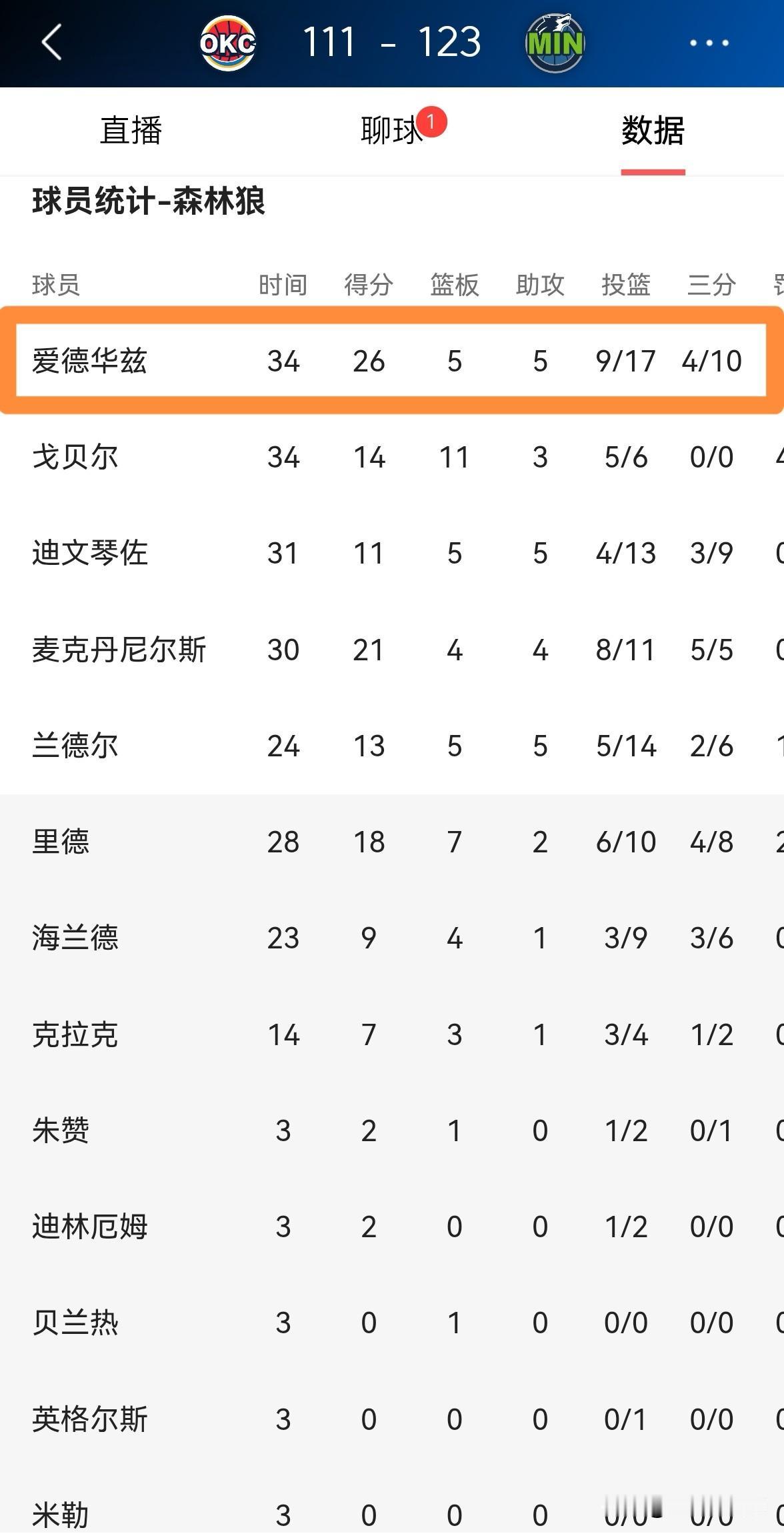 森林狼超级球星爱德华兹真是攻防一肩挑!在今天森林狼主场以123:111轻取雷霆的比赛中,爱德华兹在攻防两端都打出了无可争议的表现。 整场比赛下来,爱德华兹首发出战34分钟,投篮17中9,其中三分球10中4、罚球5中4非常高效的砍下26分,还有5篮板5助攻2抢断1盖帽,他的场上正负值为全队最高的+24。