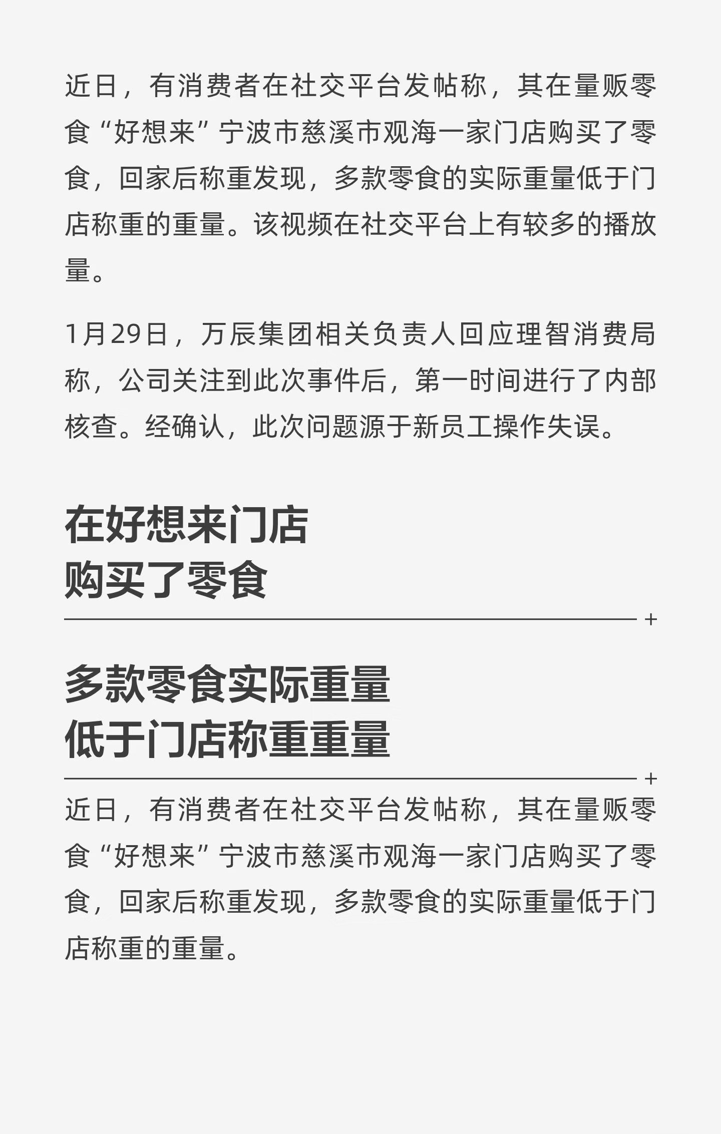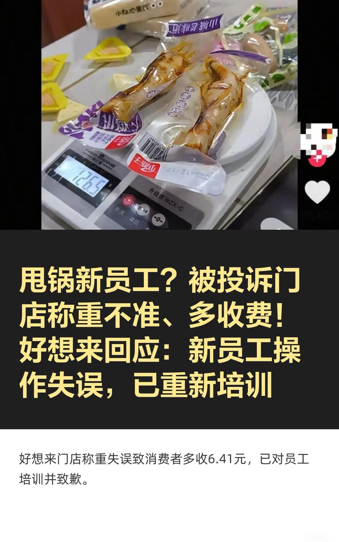 好想来零食回应针对网友质疑门店称重不准、多收费的争议,好想来官方发布回应。品牌第一时间开展内部核查,确认事件为新员工操作失误,并非电子秤存在质量问题。当地市监局现场核验,门店计量器具均合格合规。品牌已对涉事员工重新培训,主动联系消费者致歉并协商赔偿,后续将强化门店管理与员工考核,严格把控计量标准。好想来零食回应