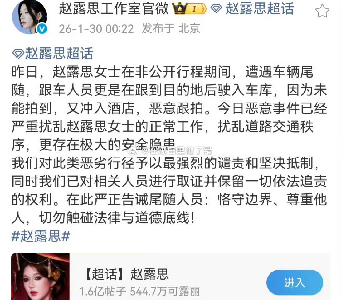 #赵露思工作室回应被尾随跟拍#【知名女演员被车辆尾随、冲入酒店跟拍,工作室回应: