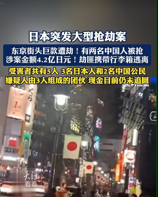 真就是“恨铁不成钢”,有些人对日本如此迷恋? 这回终于被“教训了”,损失巨大。 背后也许不简单! 日媒消息,29日晚间一个由3名嫌疑人组成的团伙在东京市中心的一条街道上抢劫了5人,并携带抢劫的行李箱逃离。受害者称,行李箱内装有约4.2亿日元(约合273万美元)现金。其中两名中国人是受害者。 中国驻日大使馆早已多次提醒在日同胞加强安全防范,偏偏挡不住一批人盲目自信日本“绝对安全”。难道2025年两名中国人在东京遭殴打抢劫的教训还不够深刻吗? 这么多钱,为何要放在行李箱内?是为了保护隐私,还是不方便上台面?这钱来路是哪的。是经贸往来,还是日本给的“招安”费用?这两名中国人,是做什么的?希望后续能有答案!