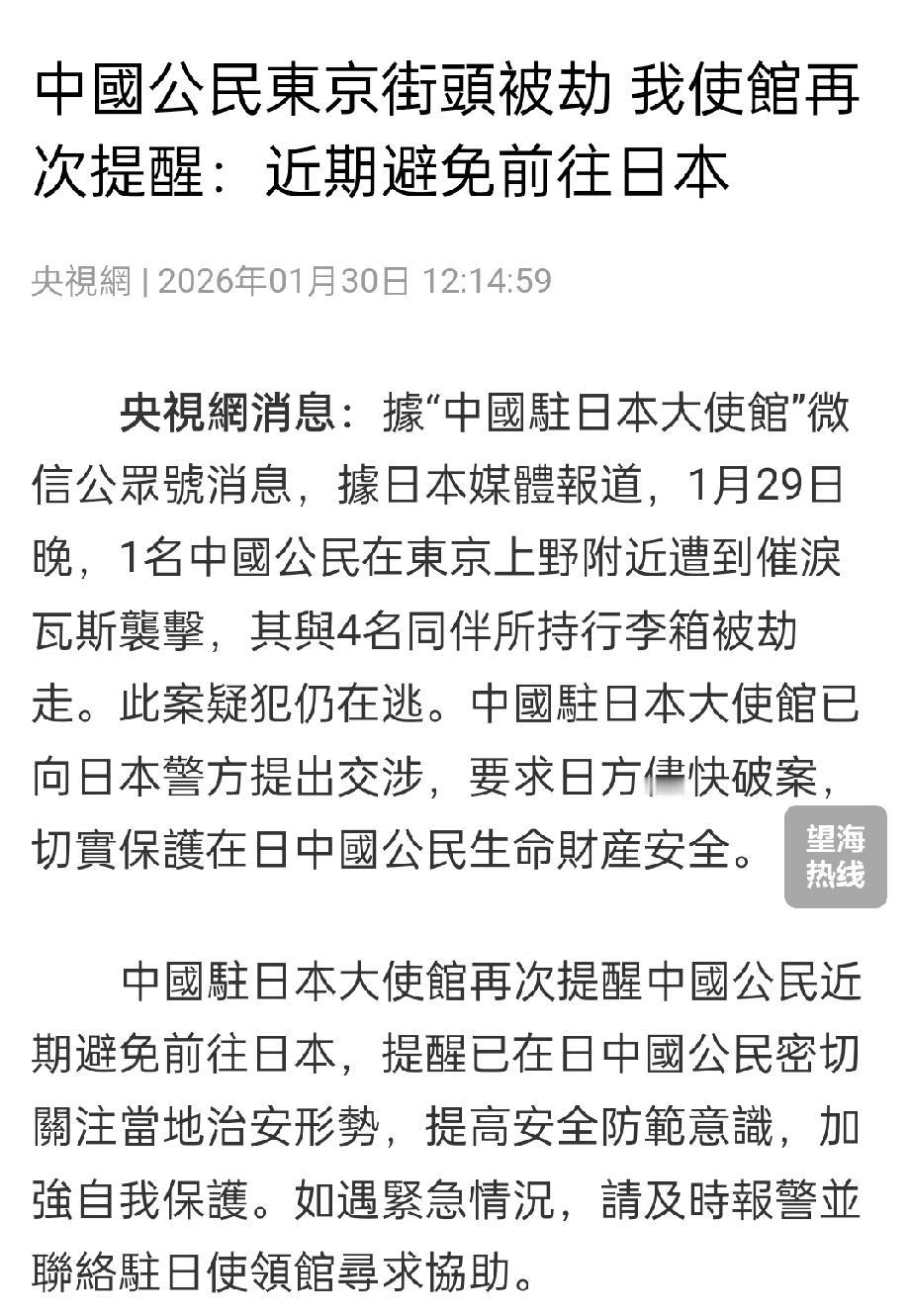 【东京街头抢劫案疑云:在日中国公民安全谁来保障?】昨晚(1月29日),东京上野街头发生恶性抢劫案,一名中国公民遭催泪瓦斯袭击,其与同伴的行李箱被劫走。据日本媒体报道,此案涉及高达4.2亿日元(约合人民币2000万元)的巨额现金东京中国人遭袭 。案发数小时后,羽田机场停车场又发生一起手法类似、针对携带1.9亿日元现金男子的袭击。两起案件疑犯均在逃,日本警方正在调查。 巨额现金来源成谜,在日华人安全引忧 案件细节令人咋舌。上野案发时,包括两名中国公民在内的五人正在向车内搬运装满现金的行李箱。日媒指出,受害者对现金归属“难以解释”,引发日本社会对资金来源的诸多猜测。**连续两起针对大额现金持有者的精准袭击**,背后是否涉及有组织犯罪,亟待日本警方彻查。 使馆紧急交涉,中日关系紧张加剧安全风险 案发后,中国驻日本大使馆已向日本警方提出交涉,要求尽快破案,并再次发布提醒,呼吁中国公民近期避免前往日本。此次安全警告并非孤立。数月来,因日本政要在涉台问题上的不当言论,中日关系持续紧张。中国外交部已多次提示在日公民的安全风险,中国航司也大规模取消了赴日航班。此次抢劫案,无疑在紧张的舆论氛围中投下了一颗石子。 历史脉络:治安神话与暗流 日本虽以“安全国家”自居,但其治安正面临新挑战。警方报告显示,针对匿名、流动的“ Tokuryu”犯罪集团的打击是当前紧要任务。同时,涉及中国公民的安全事件近期频发。就在几天前,4名中国公民在北海道遭遇交通事故受伤;去年,更发生过中国公民在东京地铁遭暴力袭击致伤的恶性事件。一系列事件叠加,让在日中国公民的安全感大打折扣。 此案已超出普通刑事犯罪范畴,巨额现金、连环作案、敏感时期,每一个要素都挑动着神经。日本警方能否迅速破案、查明真相,不仅关乎正义,更是对日本治安环境和外交姿态的一次直接考验。 各位朋友,你对这次事件怎么看?你认为公民在海外,如何更好地保障自身人身与财产安全? 欢迎在评论区分享你的观点。(图源央视网截图:)东京抢劫案 使馆提醒避免赴日