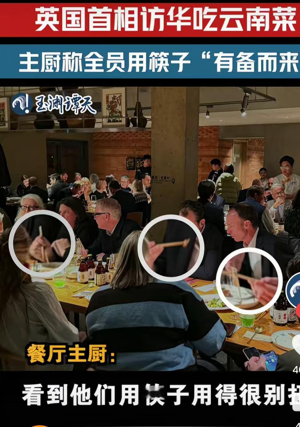 这帮英国人,算盘打得噼里啪啦响 一桌子人,整整齐齐地拿起了筷子,这画面你要跟我说是巧合,那我可真不信,跟说仪仗队走正步是碰巧走齐了一样可笑 可以猜出他们来之前是有练习过使用筷子的 这可不是简单的吃饭,里面门道深着呢。来之前,先把我们大使馆重建那事儿给批了,算是送了个见面礼。现在饭桌上再来这么一出,姿态摆得足足的 说白了,就是把意思亮给你看:这桌菜,我是来一起吃的,不是来当菜的。想上桌,就得学会用筷子,这是规矩 “要么主动执筷子上桌,要么甘愿当菜让筷子挟” 这话糙,理不糙。看来斯塔默这帮人,是真琢磨过咱们的文化,知道怎么递话了