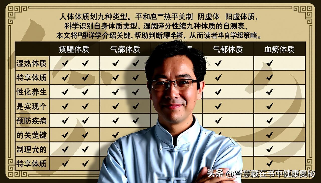 单篇内容获得阅读量破1万啦!中医将人体体质划分为九种类型:平和体质、气虚体质、阳虚体质、阴虚体质、痰湿体质、湿热体质、血瘀体质、气郁体质和特禀体质。科学识别自身体质类型,是实现个性化养生、预防疾病的关键。本文将详细介绍九种体质的自测表,帮助读者科学判断体质类型,从而制定合理的养生策略。学知识,养生命!