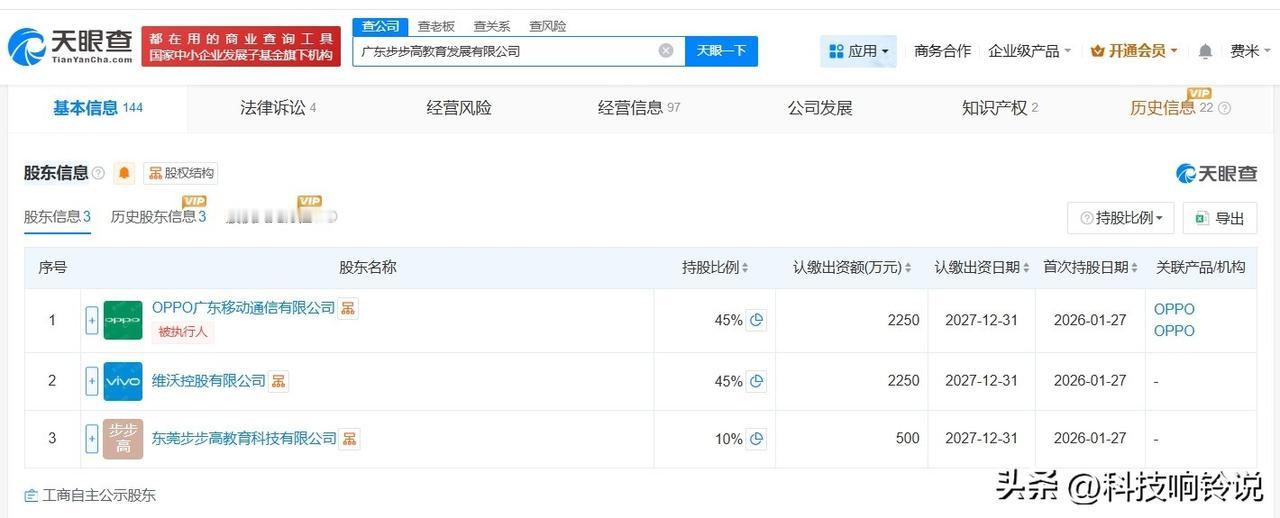 【OPPO、vivo等入股广东步步高教育发展公司】 天眼查App显示,近日,广东步步高教育发展有限公司发生工商变更,新增vivo关联公司 维沃控股有限公司、OPPO广东移动通信有限公司、东莞步步高教育科技有限公司为股东,原股东东莞市小博士教育软件有限公司、东莞市鹏派贸易有限公司退出,同时,谢勇卸任法定代表人、董事长、经理,徐育涛接任法定代表人、经理并担任董事。 该公司成立于2017年11月,注册资本5000万人民币,经营范围包括以自有资金从事投资活动、教育咨询服务、单位后勤管理服务、组织文化艺术交流活动等。 天眼查信息: