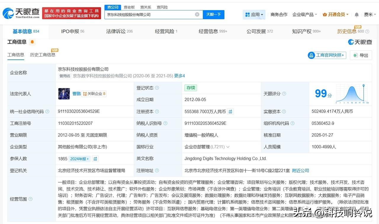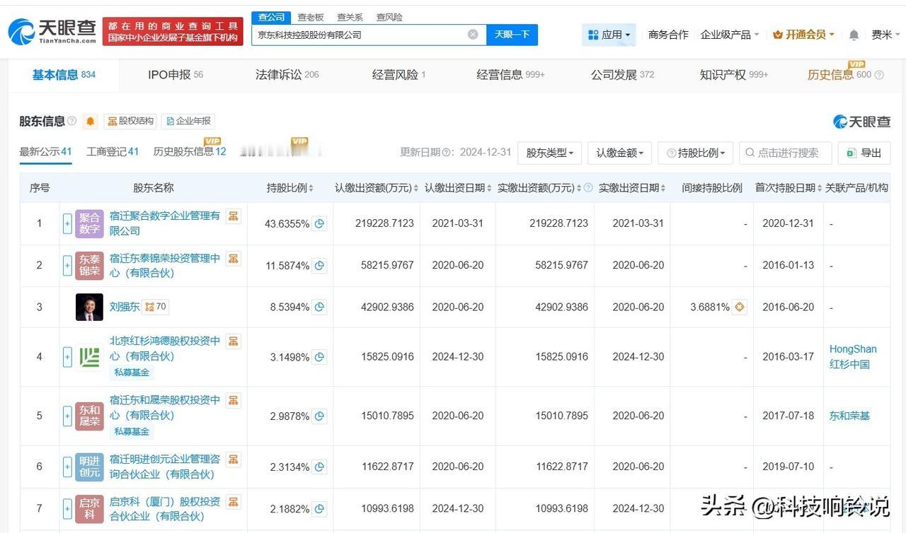 【京东科技控股增资至约55.5亿 京东科技控股近半年多次增资】 天眼查工商信息显示,近日,京东科技控股股份有限公司发生工商变更,注册资本由约53.9亿人民币增至约55.5亿人民币。值得一提的是,自去年9月以来,该公司已多次增资。 京东科技控股股份有限公司成立于2012年9月,法定代表人为曹鹏,经营范围包括企业总部管理、以自有资金从事投资活动、自有资金投资的资产管理服务、企业管理咨询等。股东信息显示,该公司由宿迁聚合数字企业管理有限公司、宿迁东泰锦荣投资管理中心(有限合伙)、刘强东等共同持股。 天眼查信息: