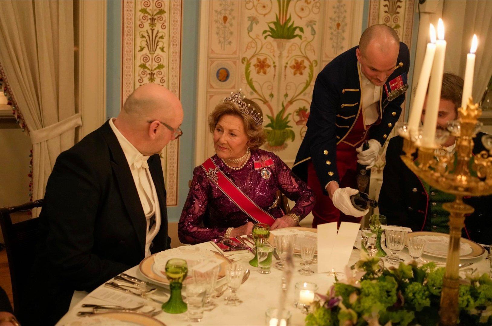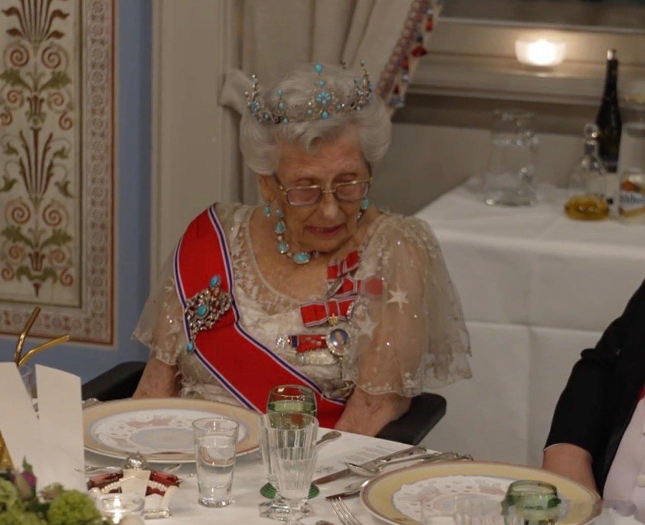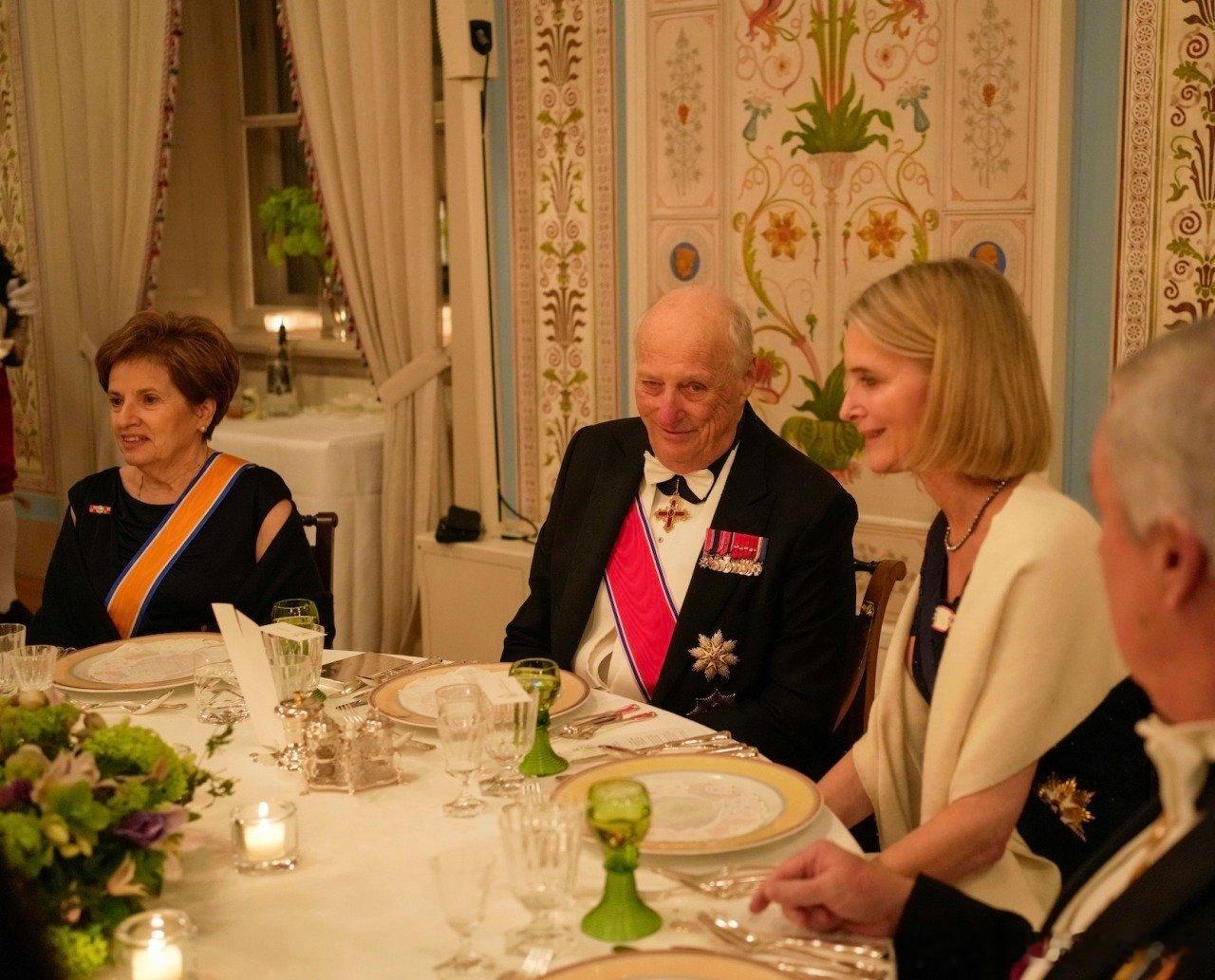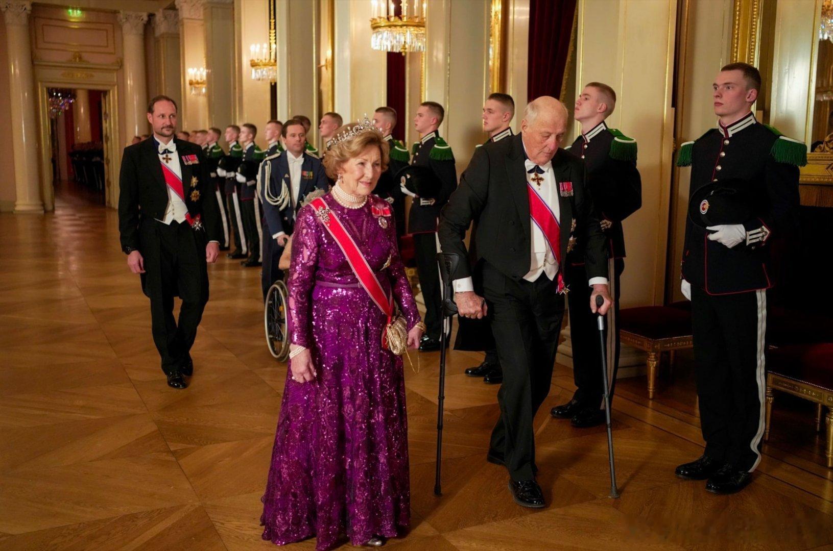新闻 2026.1.29 挪威国王夫妇、王储哈康和阿斯特里公主出席在奥斯陆王宫举办的外交接待晚宴,王储妃梅特缺席,阿斯特里这大胸针小小地惊了一下。