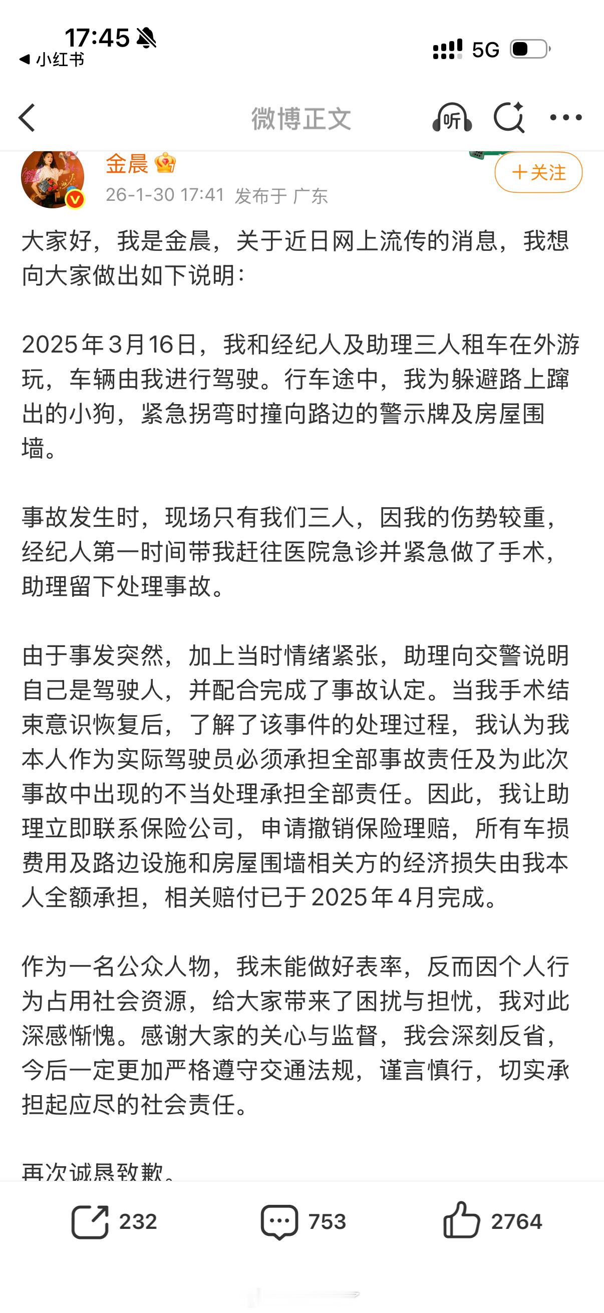 金晨就肇事逃逸发文道歉。只想说666
