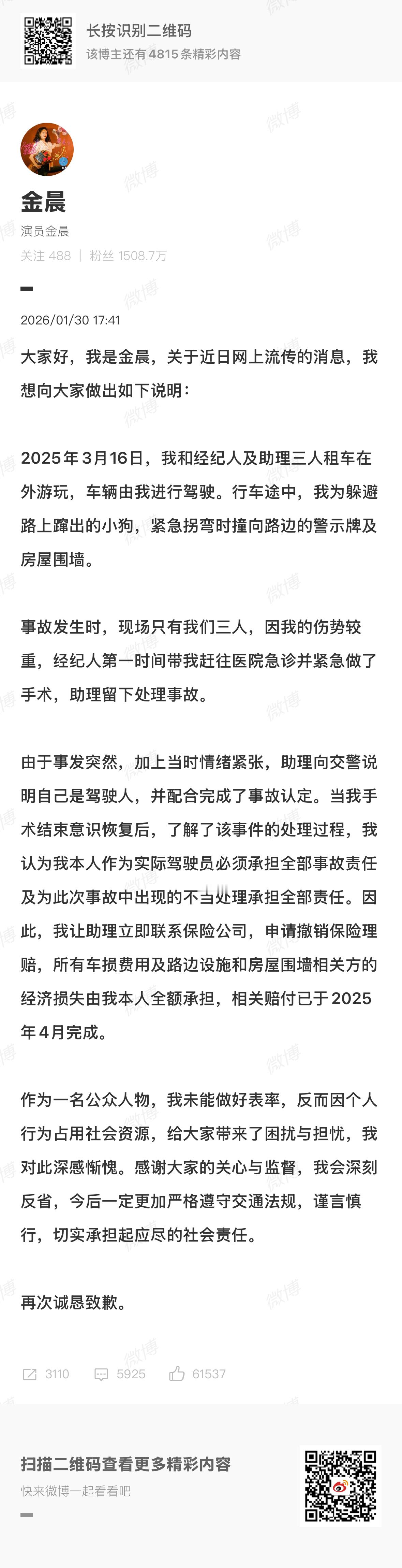 警方通报金晨事件,刚刚,警方通报金晨事件,随后也发文正式回应,称事故发生后,“因伤势较重,经纪人第一时间带我赶往医院急诊并紧急做了手术”留下助理单独处理,也表示作为公众人物会深刻反省,严格遵守交通法规。