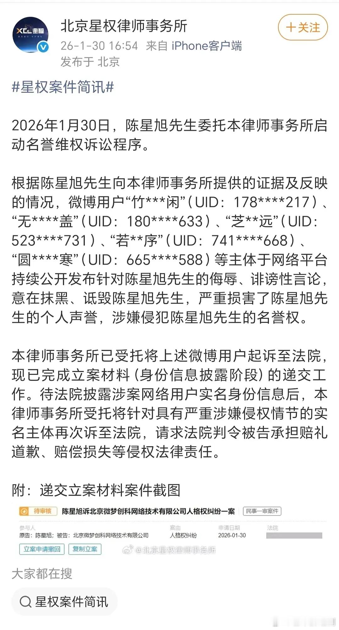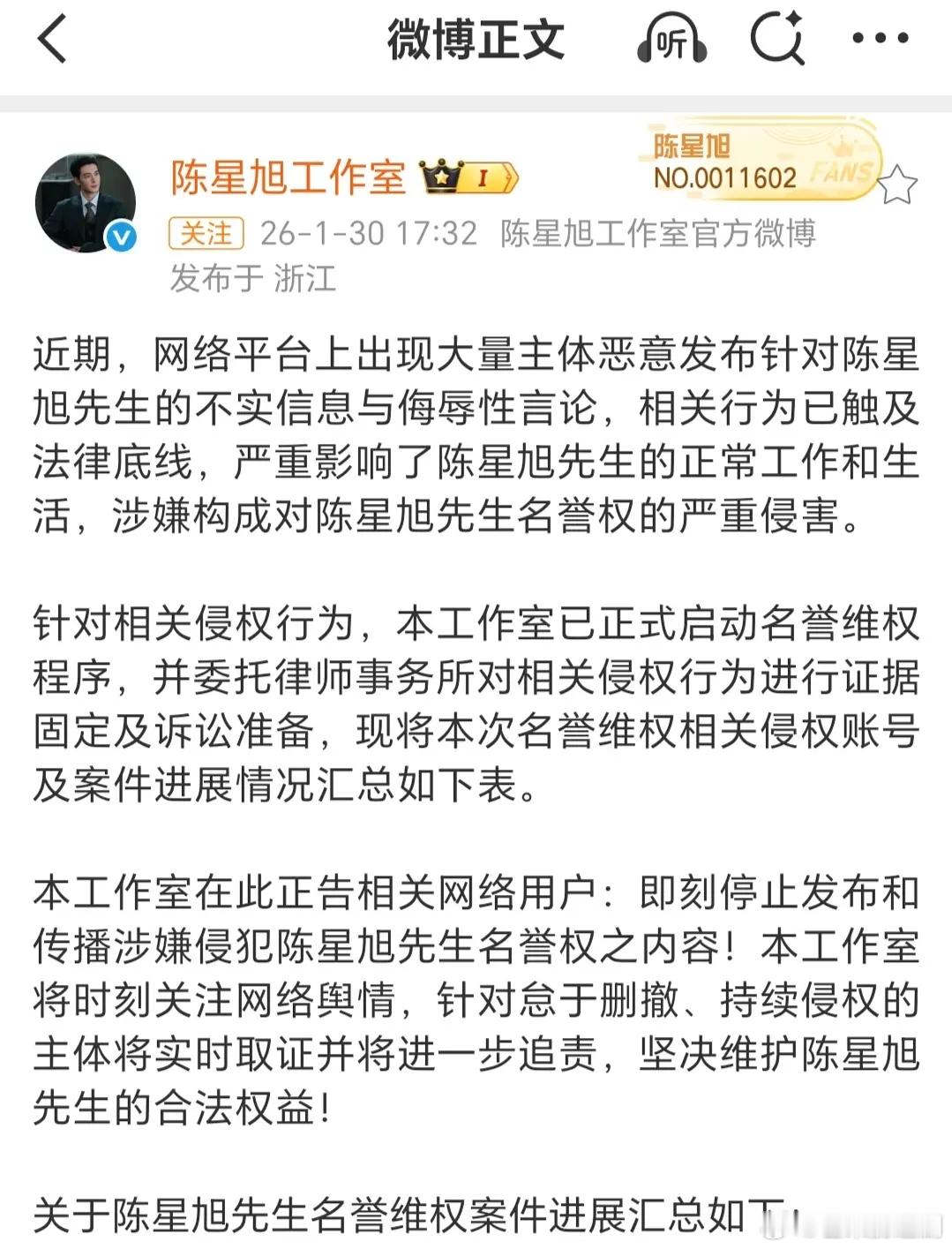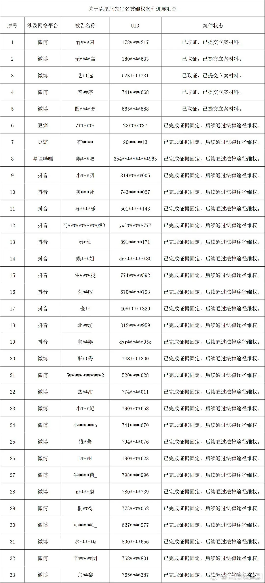 陈星旭工作室公布告黑名单以及案情进展,明知是谣言还恶意辱骂的都有取证,互联网不是法外之地。