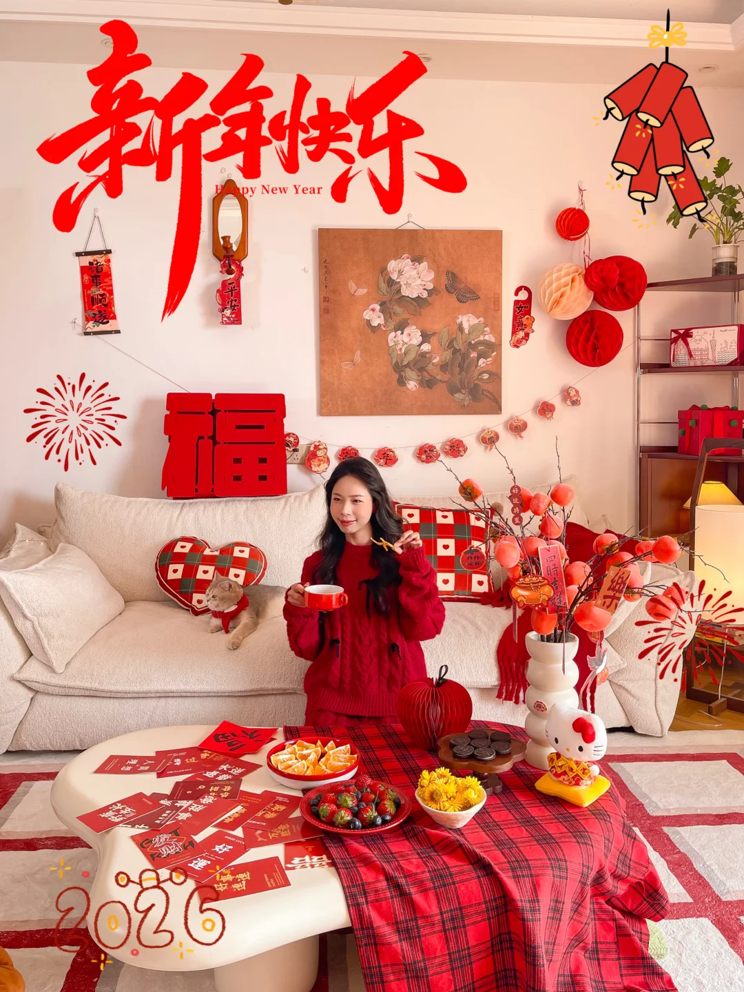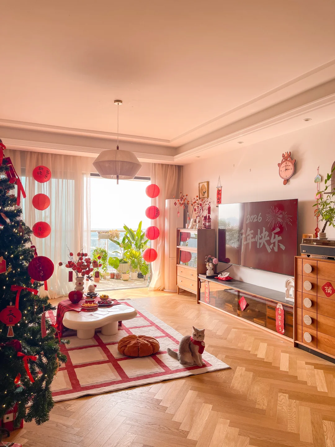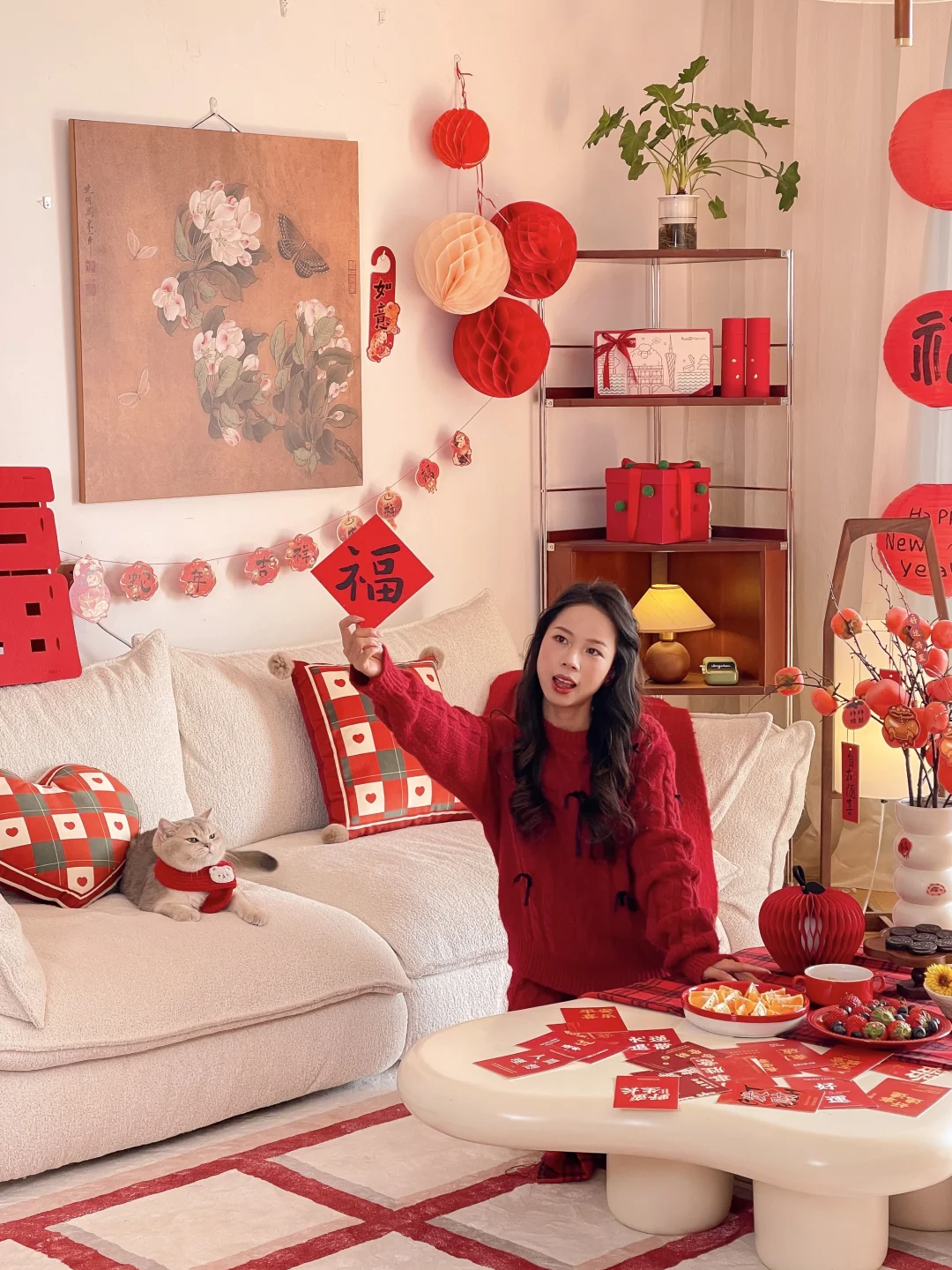 🏮把温柔的原木风客厅 染上一抹热烈的新年红 大红的“福”字往沙发一靠 红灯笼串在窗边摇摇晃晃 连茶几上都铺满了红包和果盘。 · 🏮暖乎乎的米色沙发 搭配红格纹抱枕 和满室的红撞出松弛又热闹的年味 不用复杂的装饰 一点红就能让家的温度翻番 · 🏮在熟悉的烟火气里 等新年的第一声炮响 等家人围坐的欢声笑语 这就是我想要的新年仪式感 在自己亲手布置的小窝里 迎接马年的温暖与明媚 把日子过得热气腾腾✨