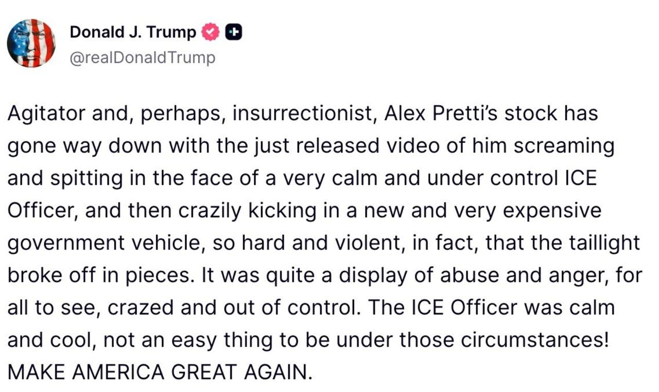 特朗普:煽动者,或许还是叛乱分子,亚历克斯·普雷蒂的形象随着刚刚发布的视频而大幅下跌——视频中他对着一位非常冷静、完全自控的ICE官员尖叫并朝其脸上吐口水,然后疯狂地猛踢一辆崭新且非常昂贵的政府车辆,踢得如此用力且暴力,以至于尾灯都被踢碎成碎片。这是一场所有人有目共睹的虐待与愤怒表演,疯狂且失控。ICE官员冷静而从容,在那种情况下做到这一点并不容易!让美国再次伟大。