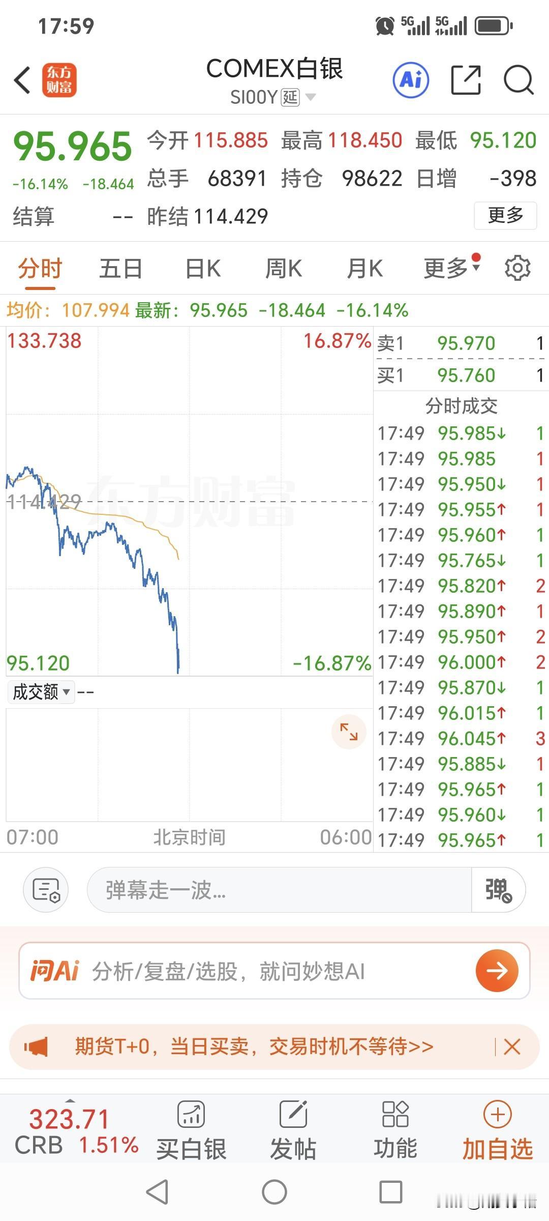 前几天, 贵金属的上涨速度, 超过分析师写报告的时间。 今日下跌速度超过大家的想象。 下午四五点还在说, 白银要跌破100美元,到两位数。 刚看了眼, 国际白银期货价格 现在为95.965美元,下跌16.14%。 成功跌破100美元。 真是又暴涨就有暴跌! 完美的风险教育课。