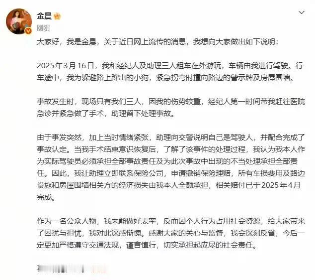 真相大白了,金晨是清白的,她没有肇事逃逸,也没有让助理徐长青顶包。 她离开现场是因为她受伤了,她的经纪人带着她去医院处理伤口,留下了她的助理在现场处理相关事宜,是她的助理主动向交警说自己是驾驶人的。 她也没有骗保,她知道是自己的主要责任,主动联系保险公司撤销了相关理赔事宜。 撞坏的标识牌和墙面已经于2025年4月理赔完了。